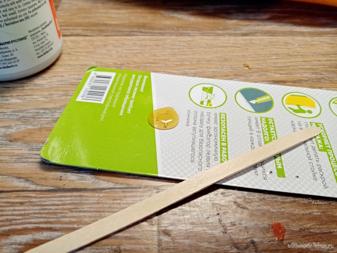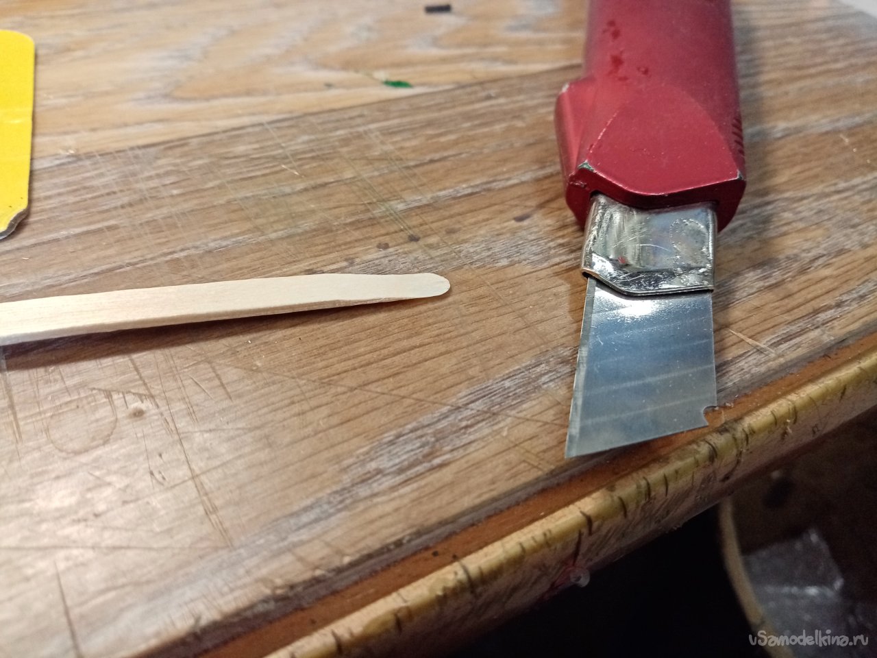 С нижней стороны есть небольшие трещины по шву. Нужно нанести клей в узкое место. Канцелярским ножом с выдвигающимся лезвием сострагиваю кончик палочки от мороженного.