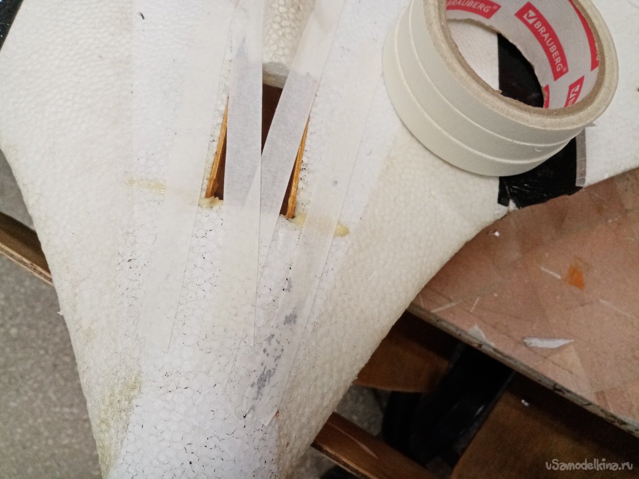 Дальше по стандарту. Наношу клей, жду пенку и устанавливаю рейку усиления в прорез корпуса. Закрепляю полосками малярного скотча.