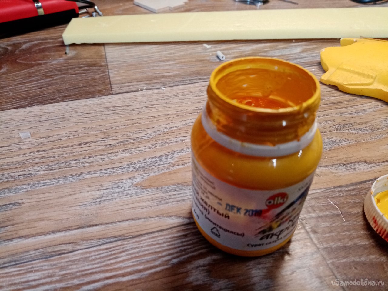 Подобрал акриловую краску желтого цвета и полностью окрасил все места на три раза. Просто кисточкой.