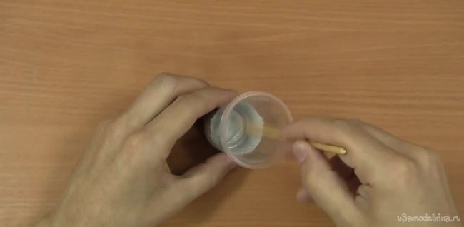 Теперь пришло время для самого ответственного момента. Нам необходимо взять акриловую краску и средство для мытья посуды. Эти компоненты нужно перемешать специальной пропорцией. В маленький сосуд нужно налить 5 частей акриловой краски и одну часть средства для мытья посуды. Хорошенько размешиваем компоненты.