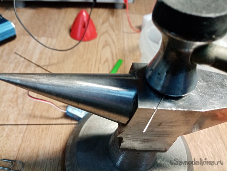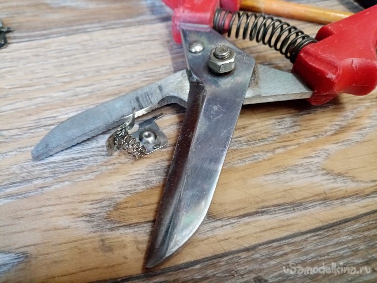 Старые универсальные ножницы для бытового применения дома и в саду как я подозреваю. Довольно хорошо режут тонкий металл. Мне нужно разрезать на две запчасти токую контактную пластину. С одной стороны будет пружина, с другой выпуклость. Разрезал. Немного поправил молотком на ювелирном шпераке, оставшимся у меня от прошлой жизни.