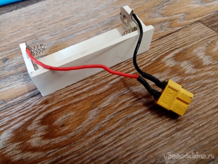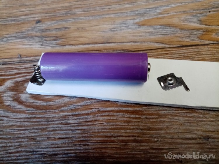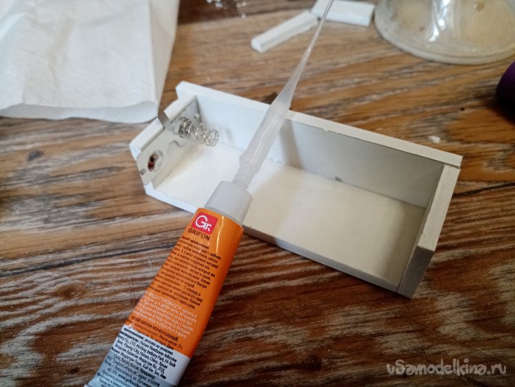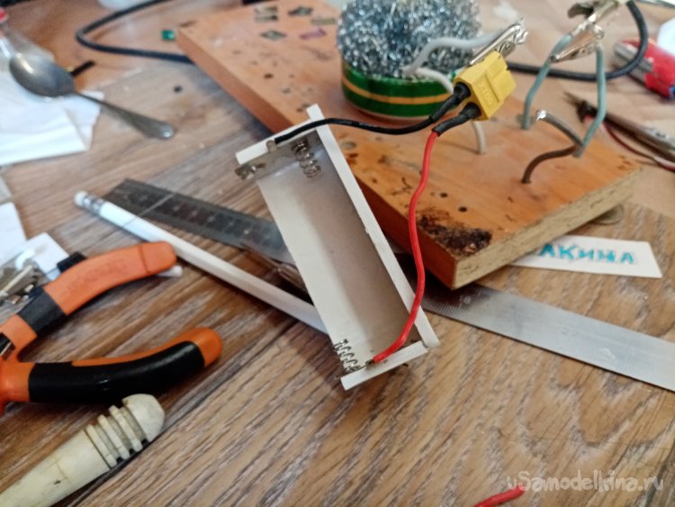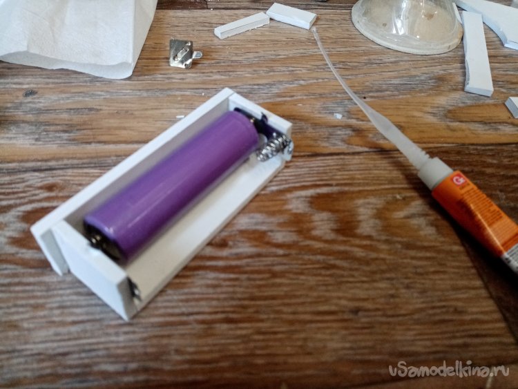 После склейки коробочки, без одной стенки конечно. Примеряю аккумулятор и контакты. Все хорошо рассчитал нормально. Нужно закрепить железки и припаять провода.