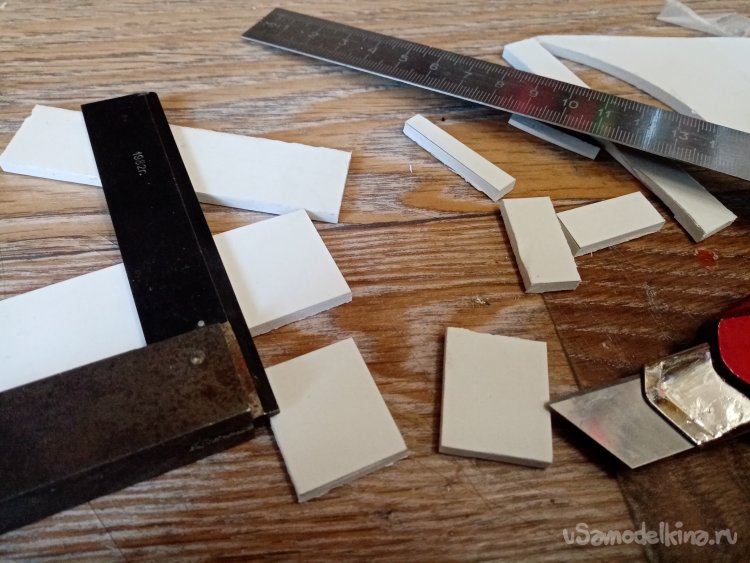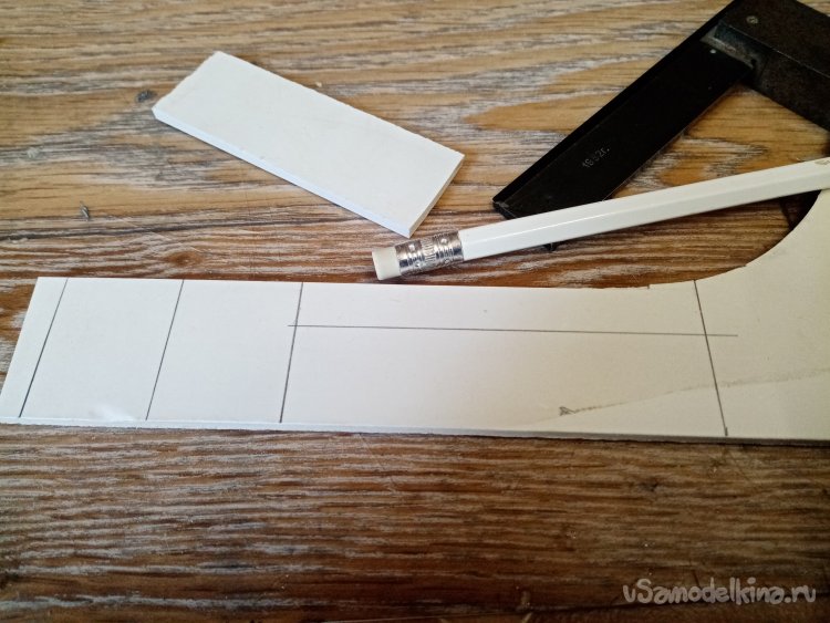 На белом рекламном пластике размечаю положение силовых стенок. Мне очень нравится этот материал. В меру прочный, пластичный. Можно пилить, резать, строгать. Отлично склеивается циакрином. Незаменимый материал в моделизме.