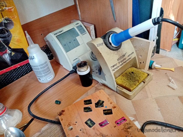 В процесс вступает паяльная станция. Очень хороший аппарат. В прошлой жизни притащил его из германии. Клон знаменитого паяльника «Соломон». Помимо выставления температуры есть еще и таймер. Можно выставить время. Прихожу на работу к 9 утра, паяло горячее, ухожу а 18 нуль нуль и нет беспокойства. Все горячее выключено. Очень хорошая функция. Выставляю на паяльнике повышенную температуру в 300 градусов. Работать нужно быстро и мощно. Рядом пластик.