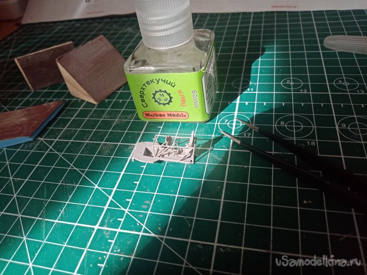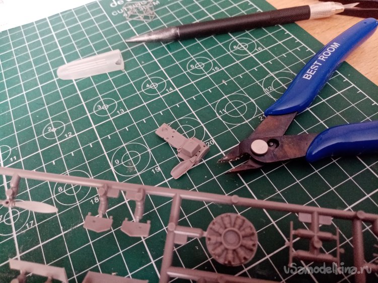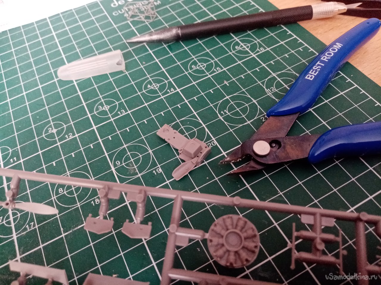 Начинаю изготовление с элементов внутреннего убранства кабины пилота. Отрезаю детали от рамки. Простыми и некрасивыми кусачками. Пол, кресло пилота, элементы управления.
