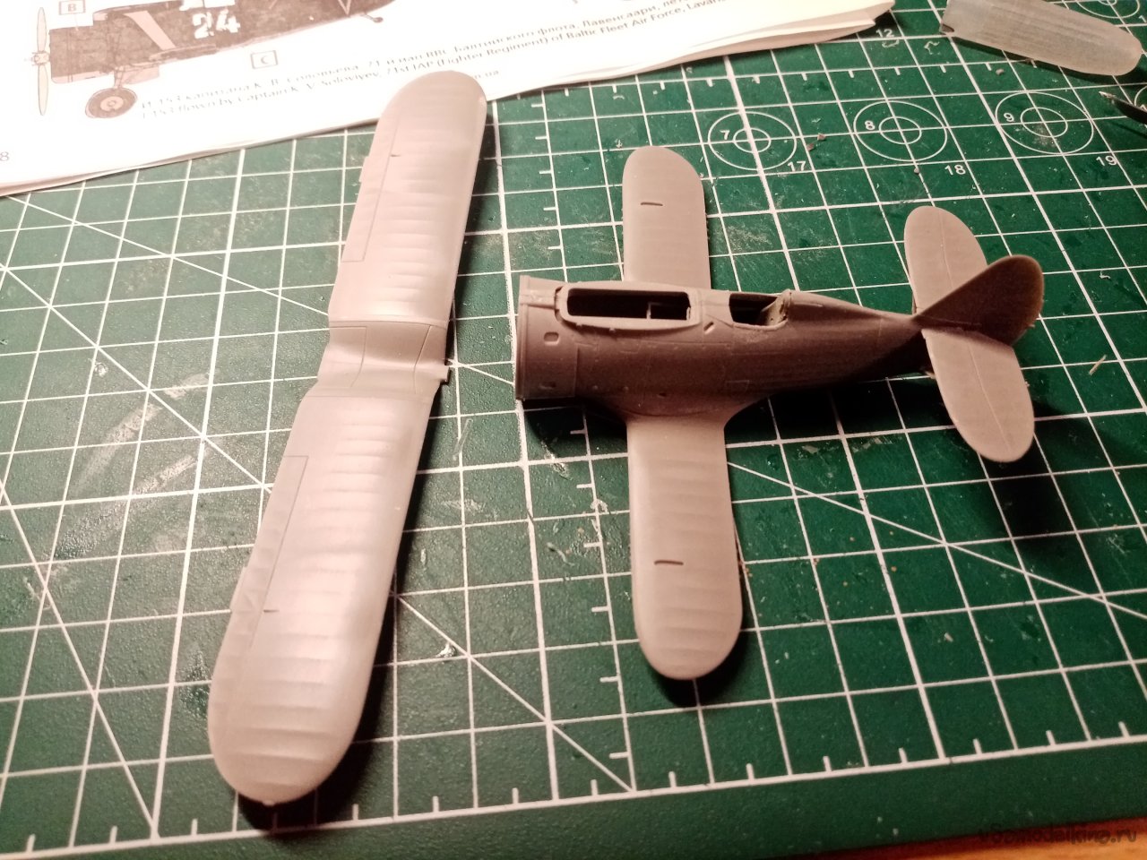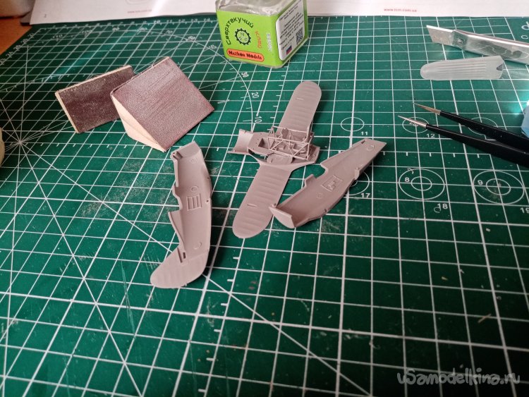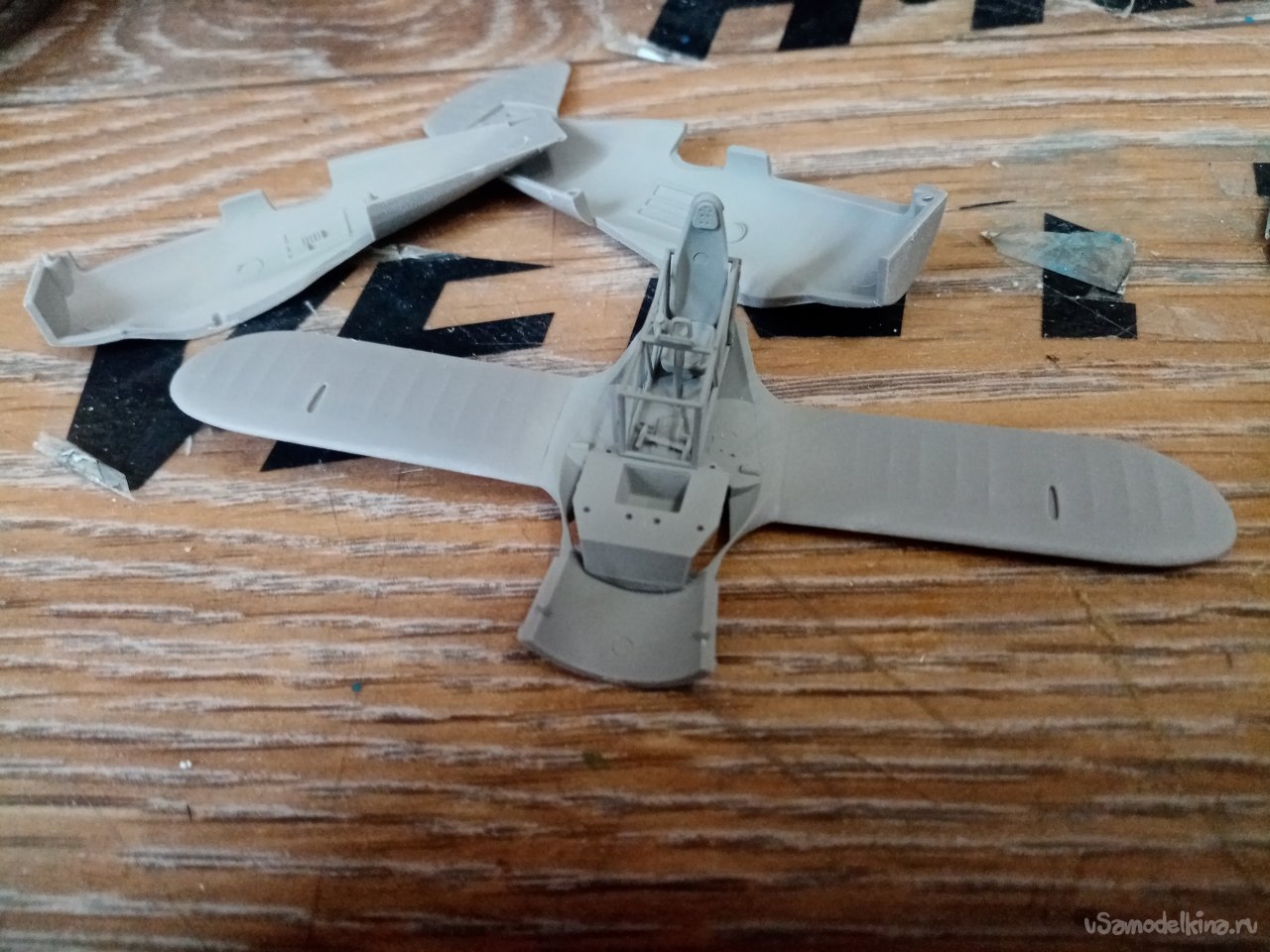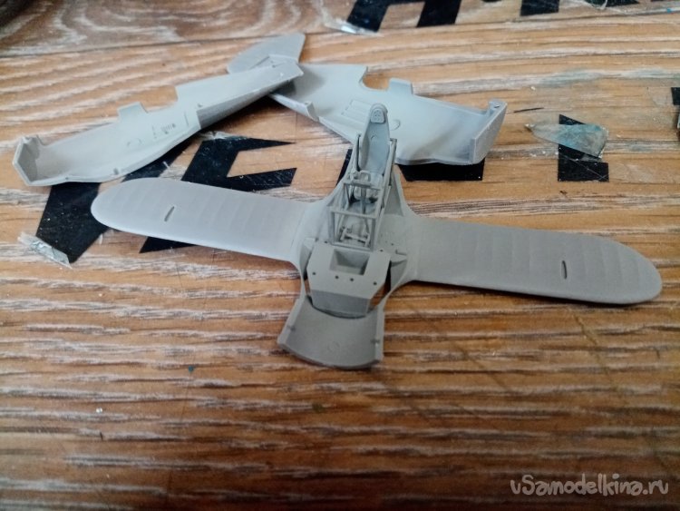 После окраски всей внутренней части кабины можно собирать фюзеляж и крылья. Продолжаю откусывать нужные элементы от рамок. Облоя не много, практически нет. Элементы стыкуются хорошо. Шпаклевать не требуется. Мой новый клей работает прекрасно. Соединяю детали и капаю на стык. Хорошо затекает и быстро схватывается. Прижал на минуту и можно продолжать работать дальше.