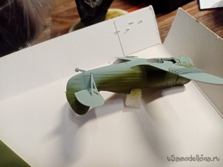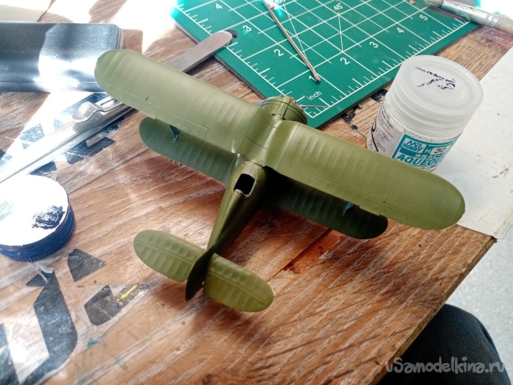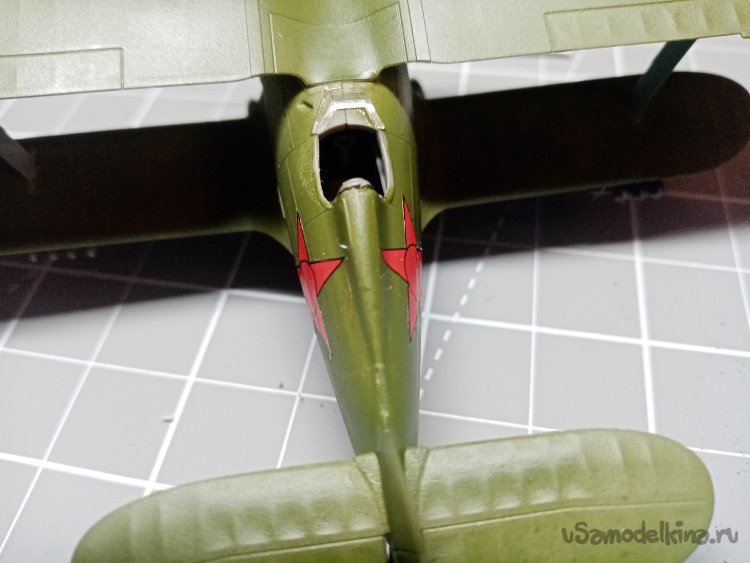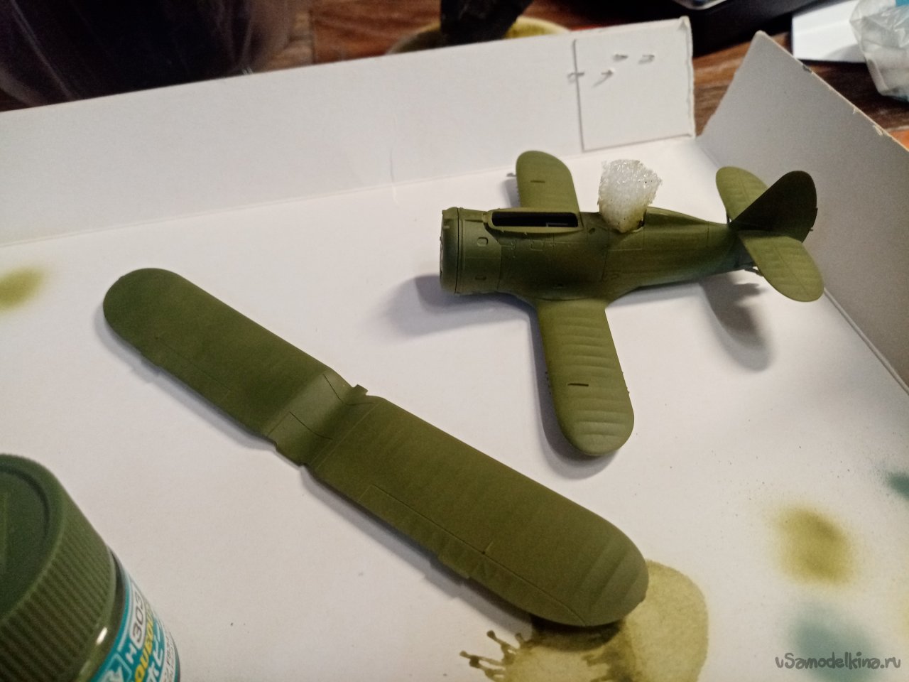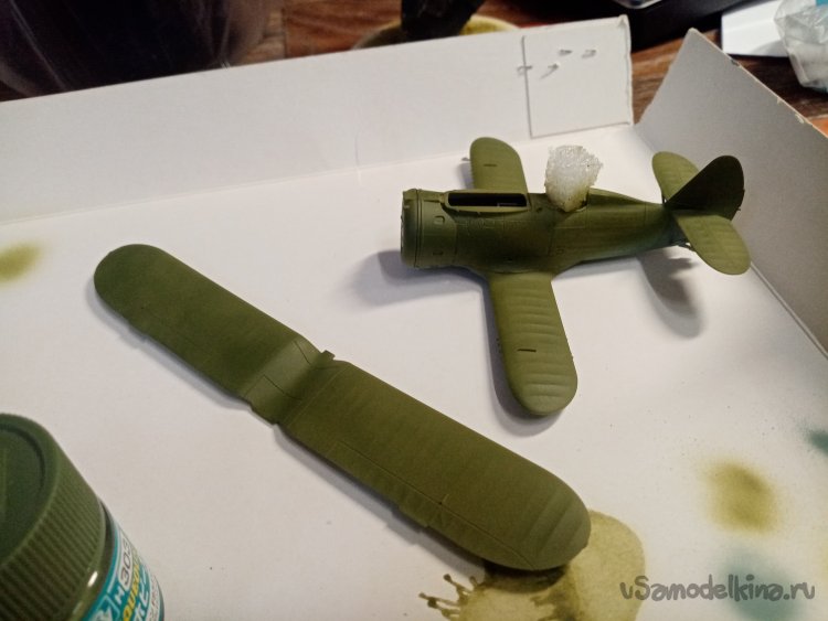 Затыкаю внутренность кабины кусочком поролона и окрашиваю верхнюю часть модели в зеленый по рекомендации из инструкции.