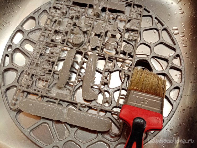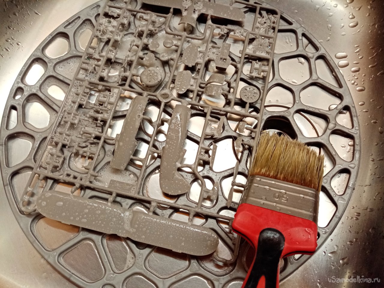 Начинаю работу с помывки. Это первое и основное правило. Нужно смыть загрязнения. Применяю для этой цели нейтральное моющее средство. «Фери». Осторожно промываю литники мягким флейцем. Внимательно слежу, чтобы не отломить маленькие детали.