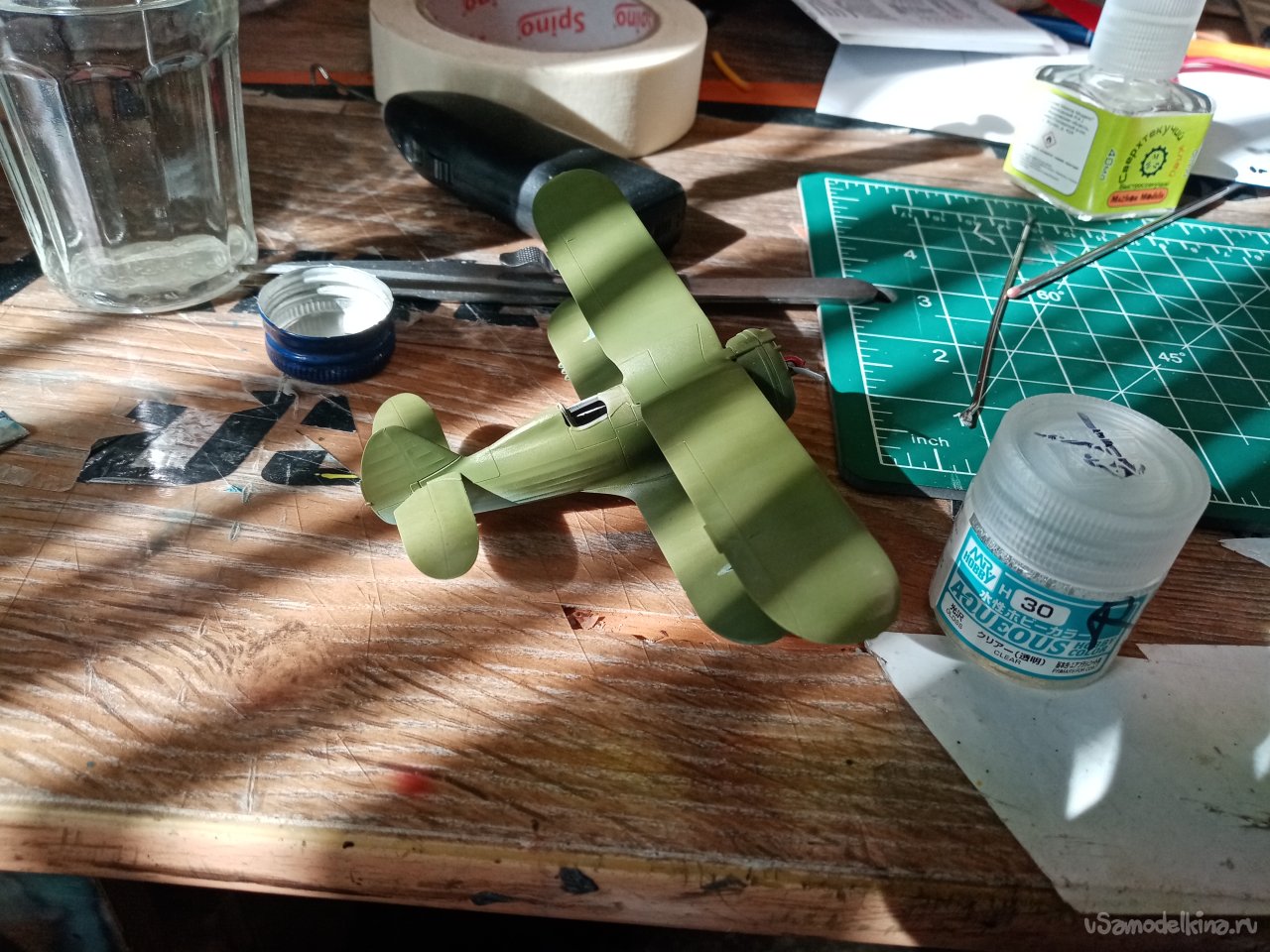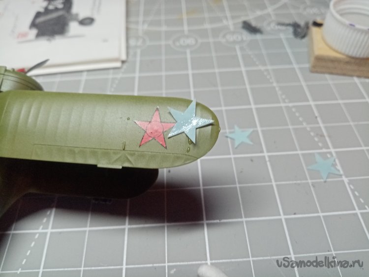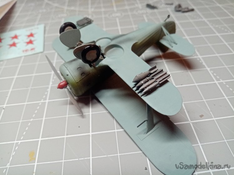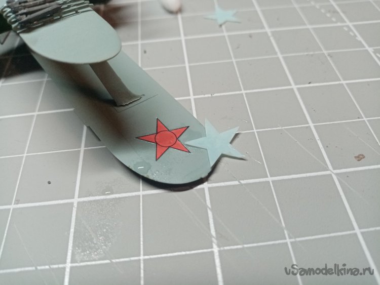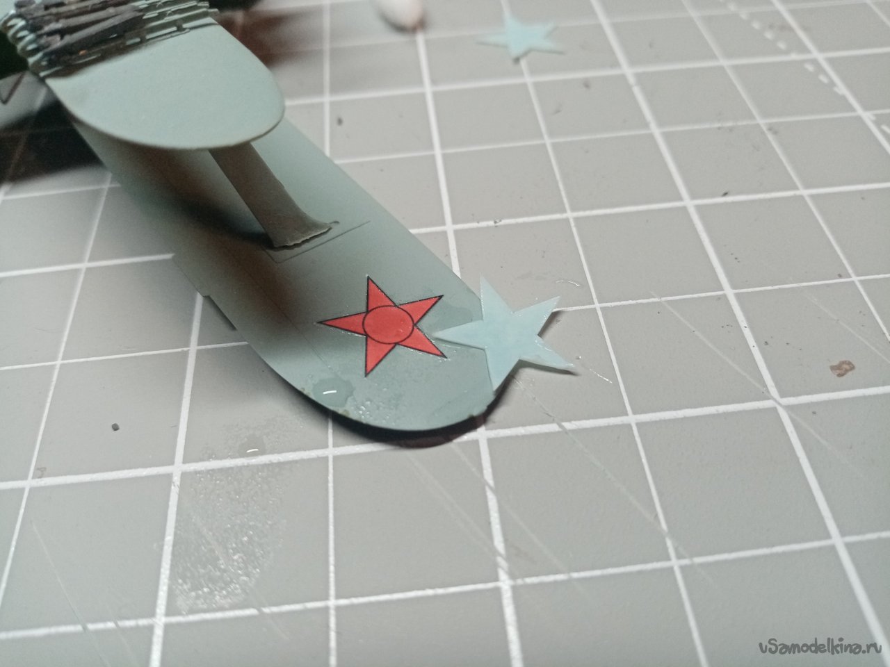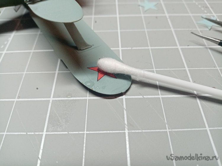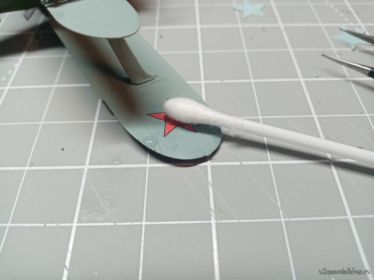 Немного подождав. Когда декали приклеятся, можно и нанести полуматовый лак на всю модель. Такой прием значительно повышает риск отклейки картинки. Клей плоховат оказался.