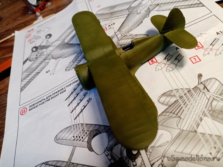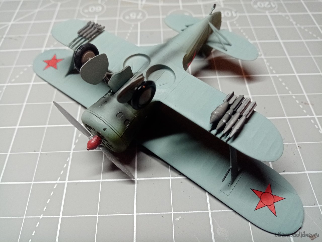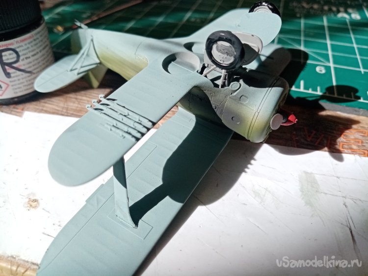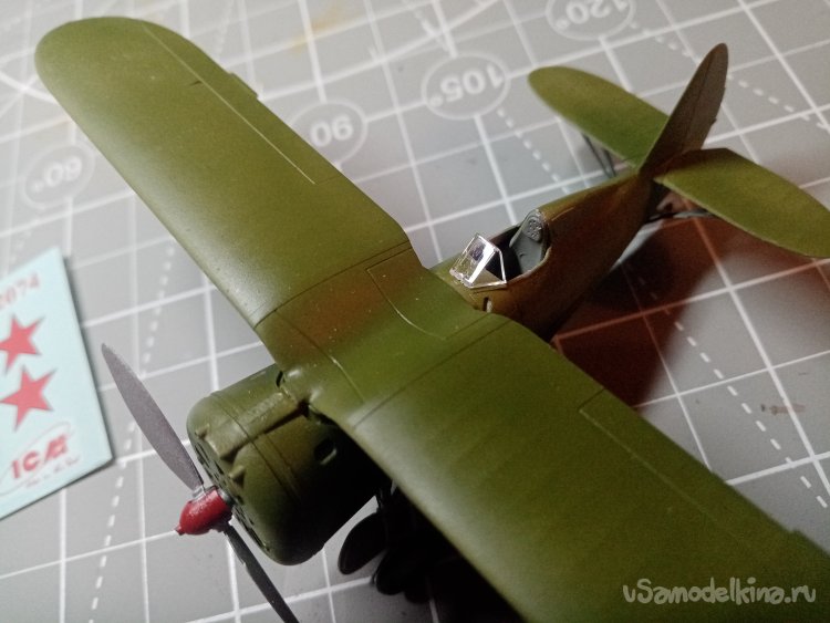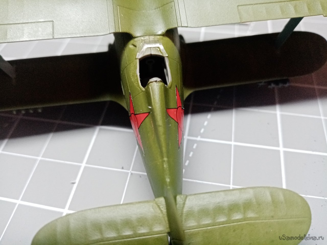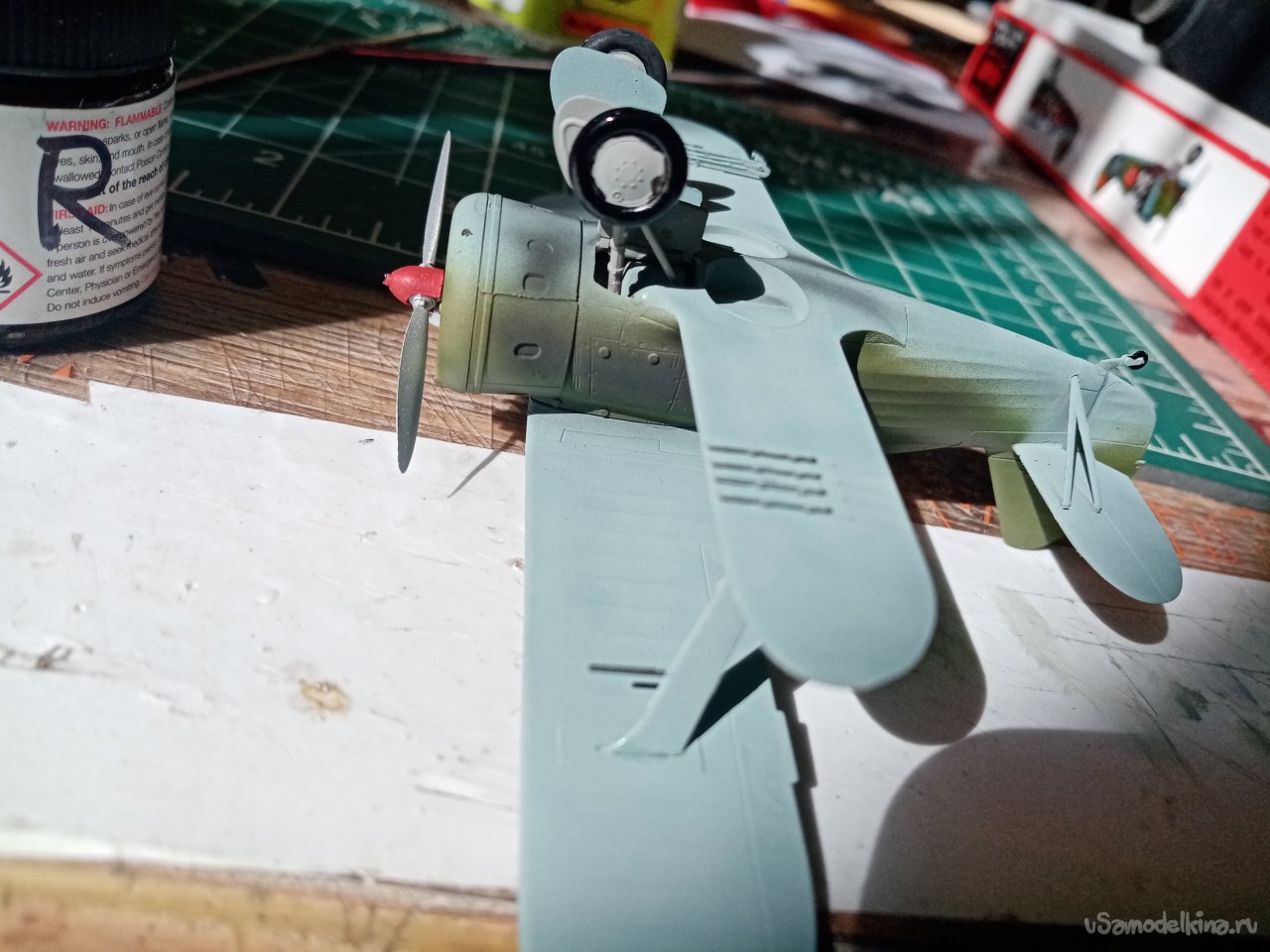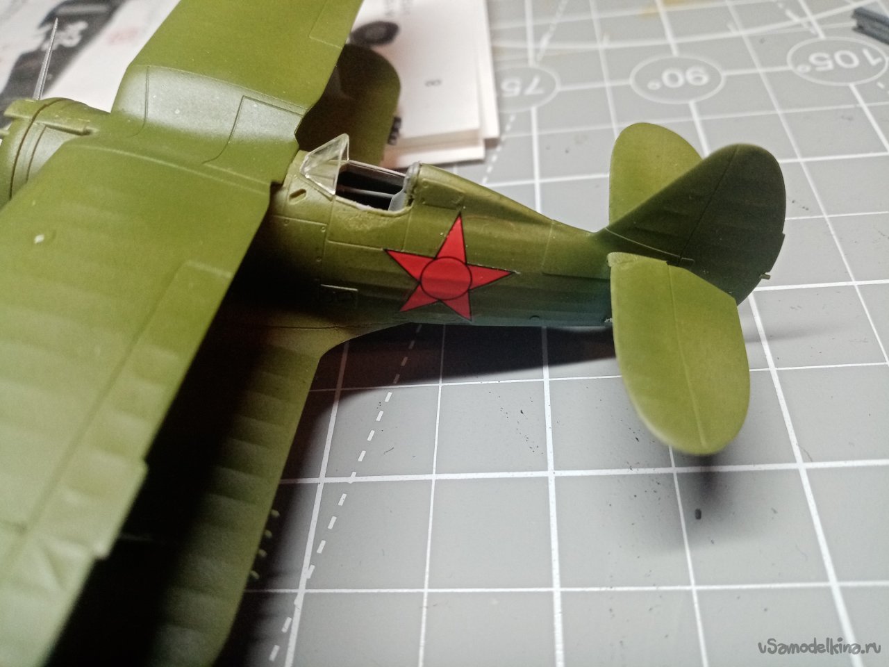Немного подождав. Когда декали приклеятся, можно и нанести полуматовый лак на всю модель. Такой прием значительно повышает риск отклейки картинки. Клей плоховат оказался.