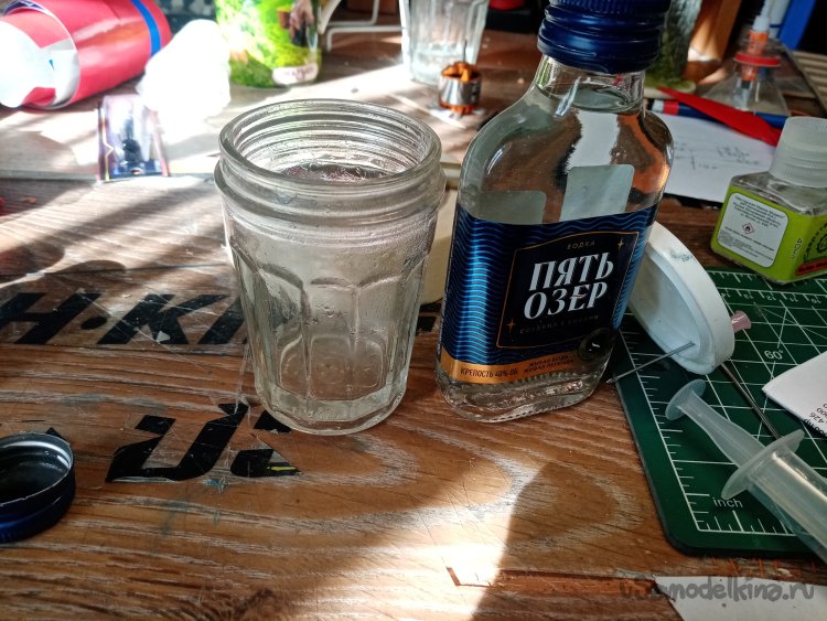 Небольшое усовершенствование забора растворителя. Покупаю дешевую водку стаканчиками или в бутылочках. Протыкаю пробку толстой иглой, набираю нужное количество в шприц.