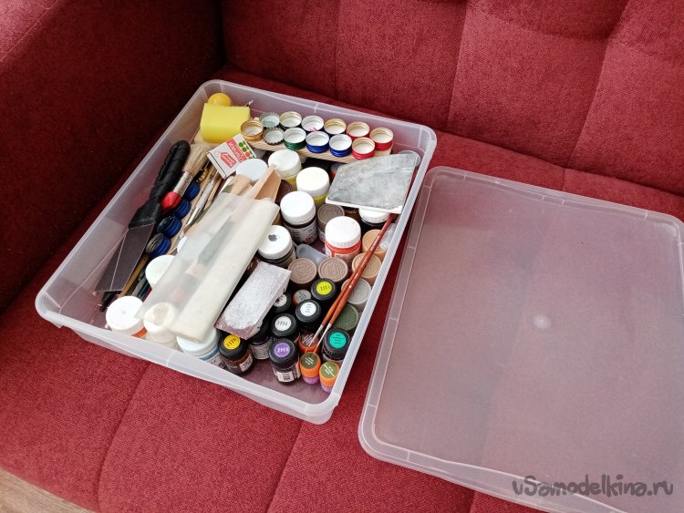 Поскольку у меня в моделке нет стационарного места для работы, со стендовыми моделями, приходится каждый раз разворачивать мобильное «приложение». Правда есть отдельная тумбочка, удобное место для размещения инструментов и красок. Палитра практически всех необходимых красок и клея размещается у меня в двух коробках, оставшихся от прежней жизни. Когда работал в сервисе. По мере надобности извлекаю и открываю соё сокровище.