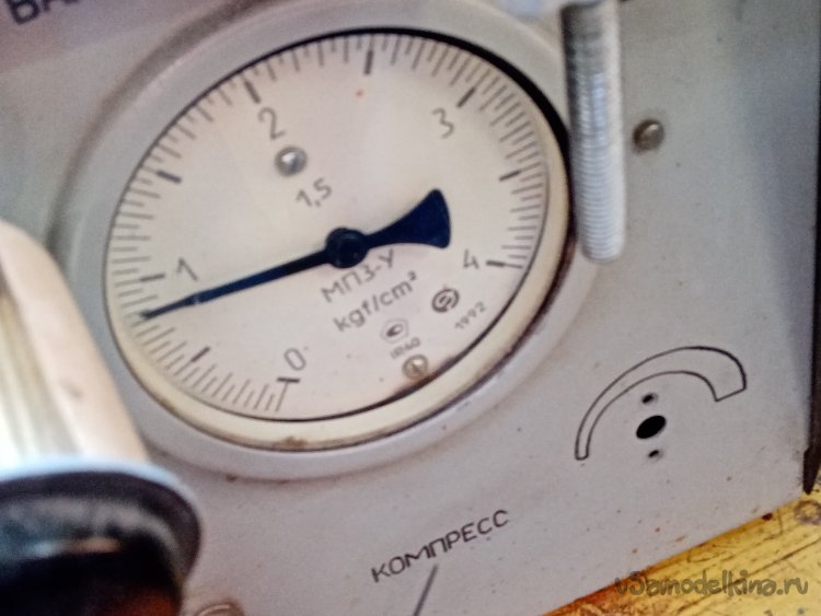 Компрессор мне достался по наследству, при ликвидации врачебного пункта. Не знаю для чего он там применялся. Но мне подходит на все сто. Внутри корпуса с большим манометром и выключателем располагается простой агрегат от холодильника. И запросто может давить до 4 очков. Но нет ресивера. При работе советским аэрографом, проблем нет. Поскольку он по конструкции прямоточный. И воздух идет постоянно. Нужна только педаль подачи краски. С современными аэрографами ситуация посложнее. Они перекрывают не только краску но и поступление воздуха. Эта конструкция идет еще из эпохи динозавров, когда воздух для работы этого агрегата поступал из баллона. Приходилось экономить. У меня изготовлен простейший клапан, который держит давление в 2 атмосферы и стравливает излишки. Есть один очень существенный плюс компрессора, он бесшумный.
