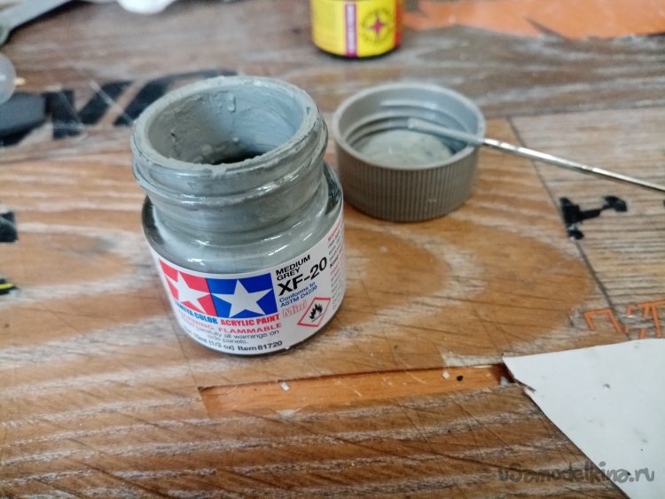 Капаю в аэрограф три капли краски от «Тамии» нужного цвета и готово. После прохожусь по интерьеру смывками. Отдельные элементы подкрашиваю в другие цвета. Вот в этом варианте краски от «Звезды» нормально себя проявили. На небольших участках кроют хорошо. Только приборную панель не рискнул, окрасил черной матовой от «Тамии».