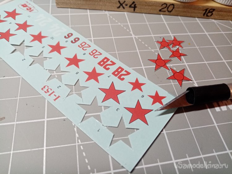 Нужно установить декали. Для этой цели мета установки нужно закрасить глянцевым лаком. Иначе может проявиться эффект блеска под пленкой. И для этой же цели отрезаю картинки в притир к изображению.