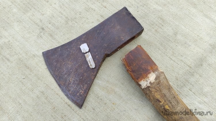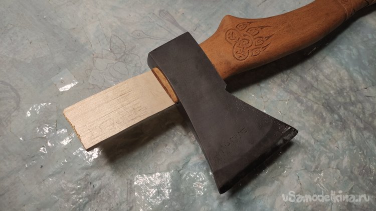 Провожу насадку «головы» на топорище, клин сажаю на клей ПВА.