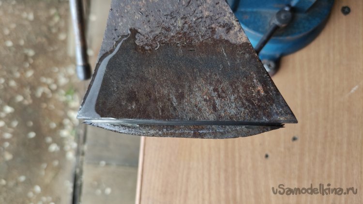 Заказчик пожелал, что бы на готовом изделии, была прямая режущая кромка. Поэтому, при помощи угловой шлифовальной машины, отрезаю лишний металл. Резку провожу не спеша, короткими подходами, что бы ни перегревать материал и не произошло отпуска закаленной области «головы» (кстати закалка в области РК - присутствует). В процессе резки постоянно охлаждаю место реза водой.