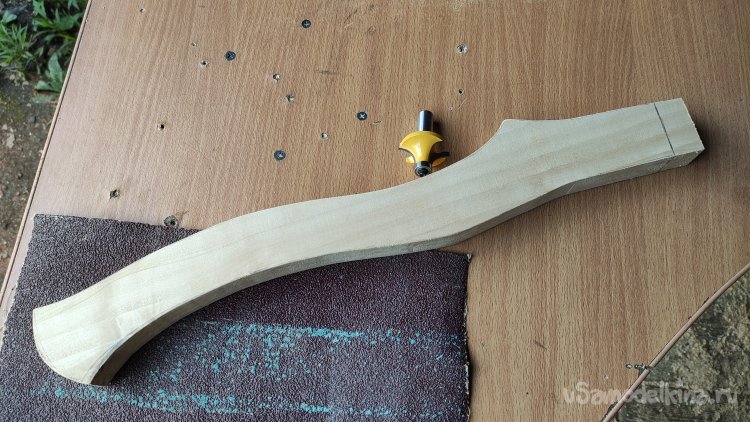 И опять же, фрезером и кромочной фрезой, закругляю верхнюю и нижнюю части топорища.