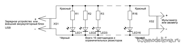 В качестве нагрузки я использовал готовую панель из 16 светодиодов и 16 ограничительных резисторов, взятую от испорченного фонаря. Её ток потребления при напряжении питания от USB (5 Вольт) составляет 0,45 Ампер, что соответствует стандартному току зарядки мобильных телефонов и прочих гаджетов.