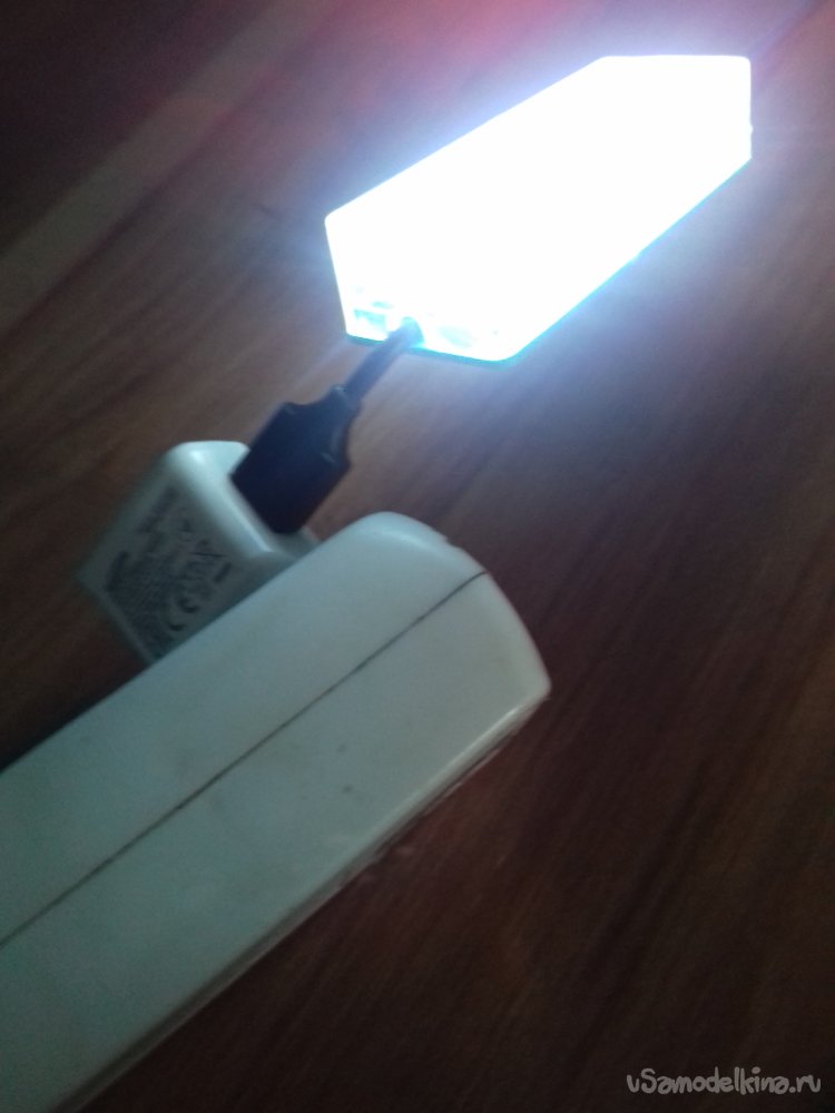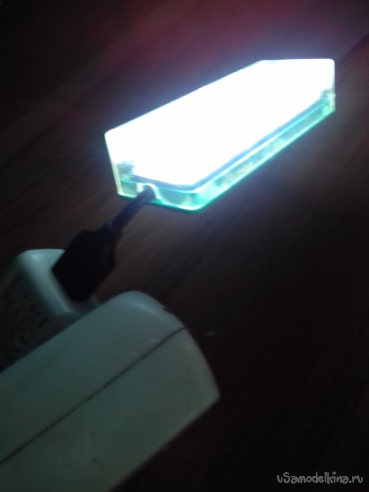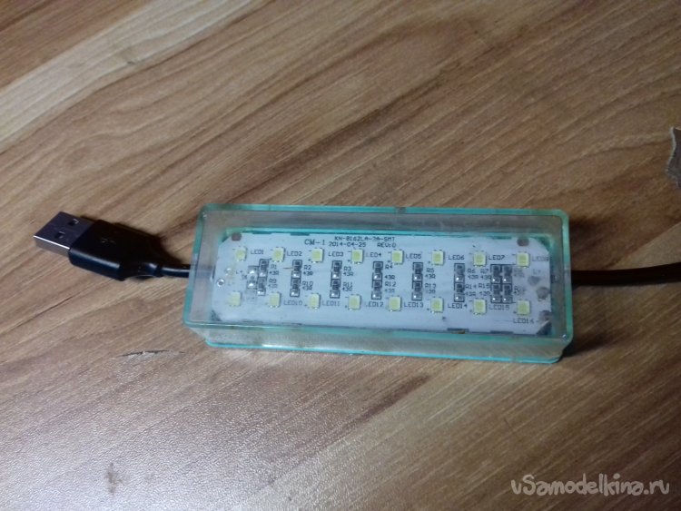Для сборки устройства были использованы детали и материалы: панель со светодиодами от испорченного фонаря, корпус, кабель USB, два зажима «крокодил», монтажный провод, термоусаживаемая трубка, термоклей, припой, канифоль.