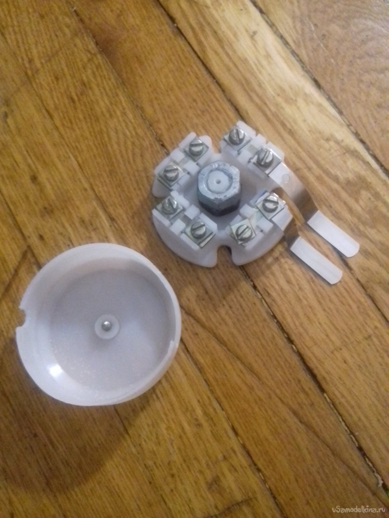 Электроды такие же, как в сигнализаторе. В качестве корпусов использовал стандартные коммутационные коробки, такие применяются в системах охранно-пожарной сигнализации. Для плотного прижатия электродов к полу на стойку в центре коробок накрутил пару массивных гаек (для утяжеления).