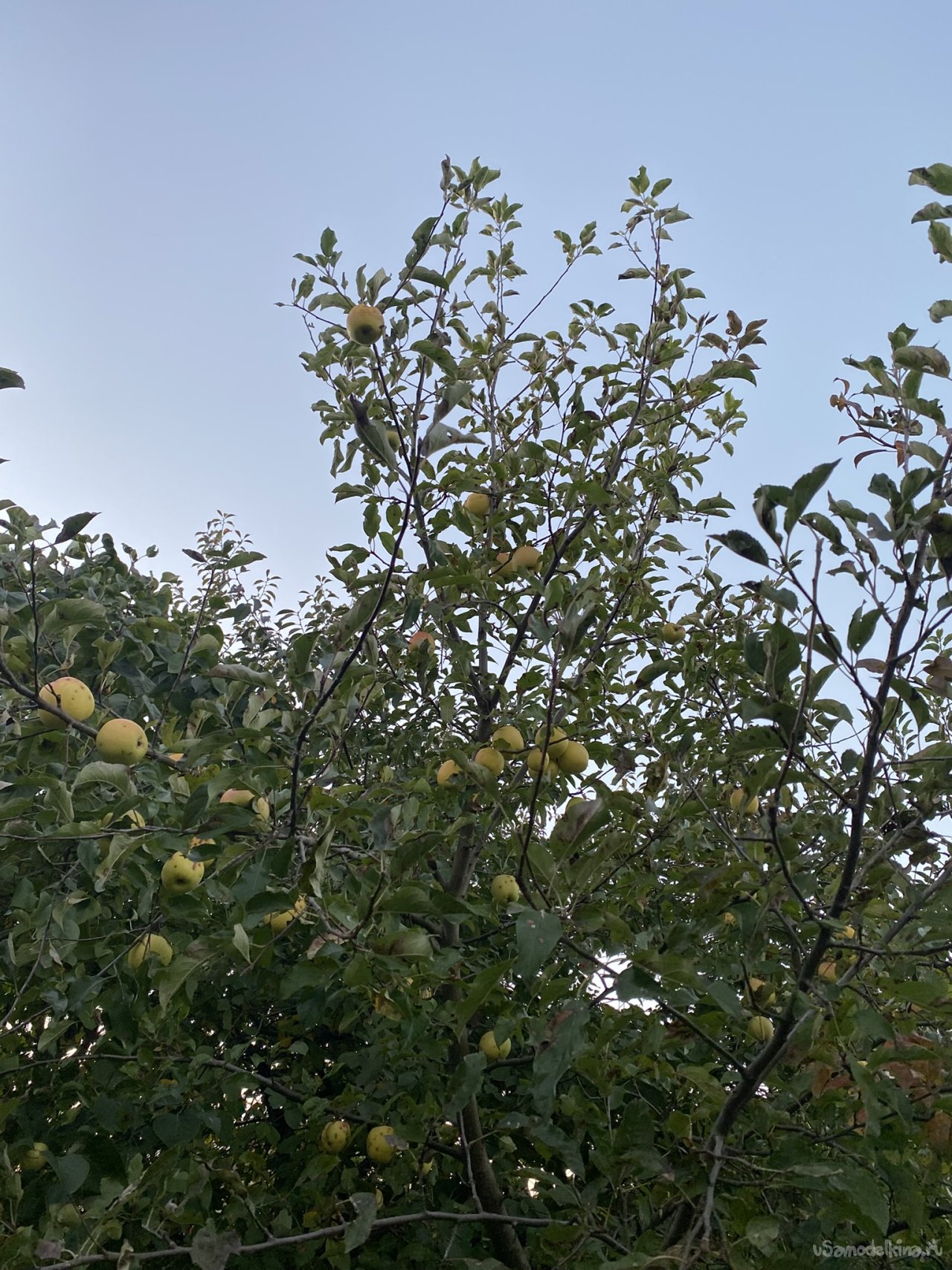 В этом году, весной, когда яблони и груши вовсю цвели, случился сильный заморозок. Не помёрзли цветы только на одной яблоне и одной груше, которые были ближе к дому, в "затишном месте". При этом, урожай был небывалым для этих деревьев. (Уж не знаю, год ли такой, или повлияло то, что в этом году я запустил капельный полив , который всё лето насыщал влагой землю под деревьями. Груши уже давненько созрели и были собраны, а вот яблоки на этой яблоне оказались поздних сортов, и потому собрали мы их только на прошлой неделе. И то, собрал я не все яблоки, а только те, до которых смог дотянуться со стремянки, так как эта яблоня довольно высокая. А на верхних ветках они остались висеть: