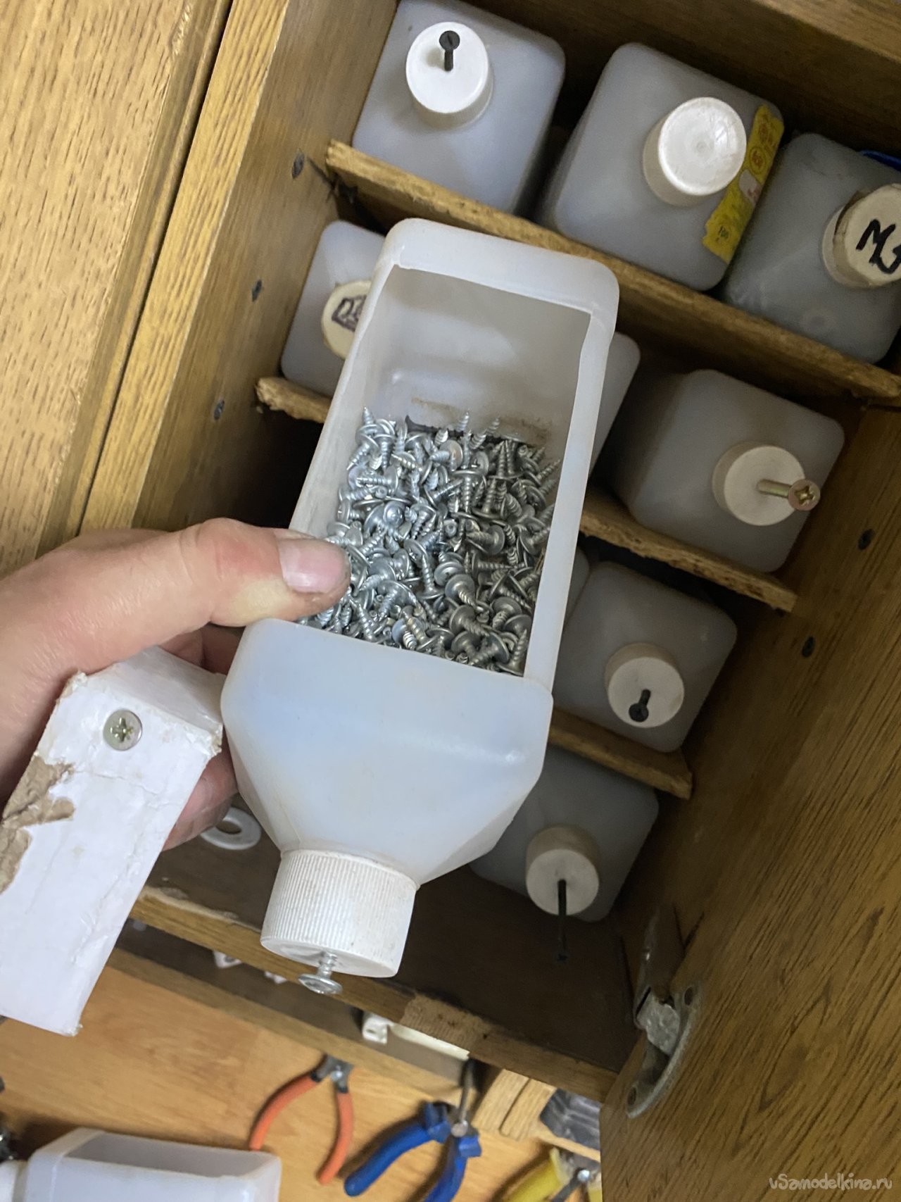 Предупредил механика, что растворитель выдаю только "на обмен", и пустые бутылки накапливаю. Из них можно много чего сделать. Например, из круглых, обоих видов, у меня в мастерской сделаны держатели для газовой горелки и рабочих перчаток на стене у печки: