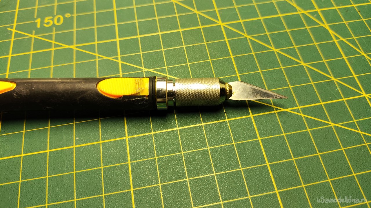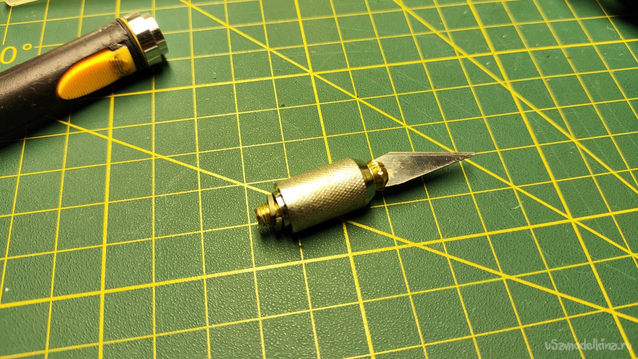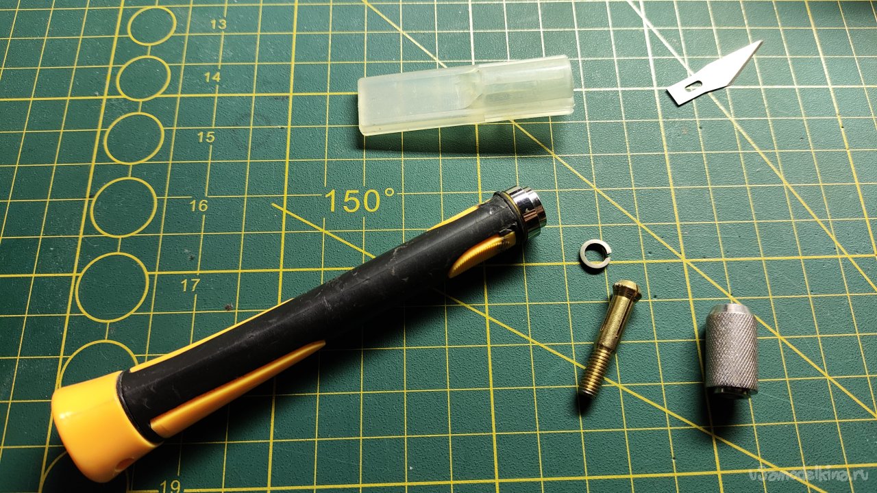 Пробую аккуратно вскрыть. Для отвертки щели очень маленькие. Попробовал рассоединить скальпелем. Неудача, лезвие скальпеля вылезло из держателя. Держатель ранее был поломан, склеил его на эпоксидный клей, видно клей попал под конец резьбы цанги, цангу нет возможности зажать. Нашел подходящую по диаметру граверную шайбу.