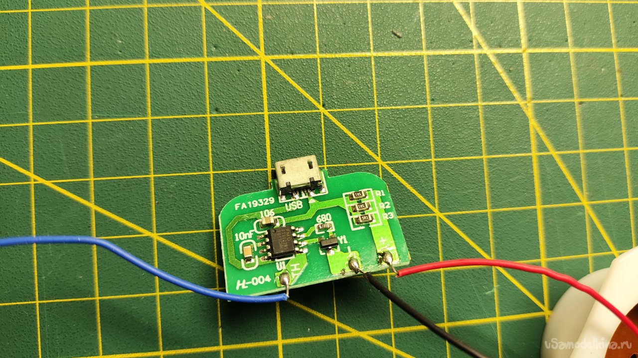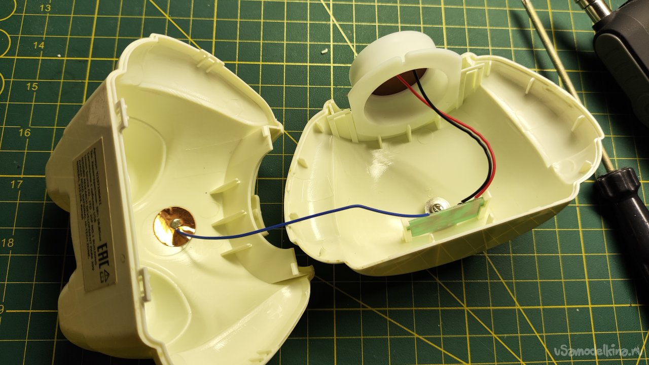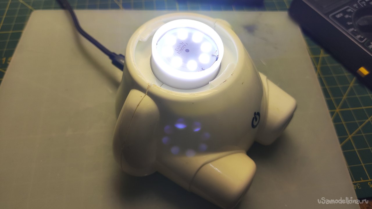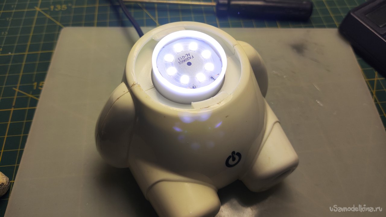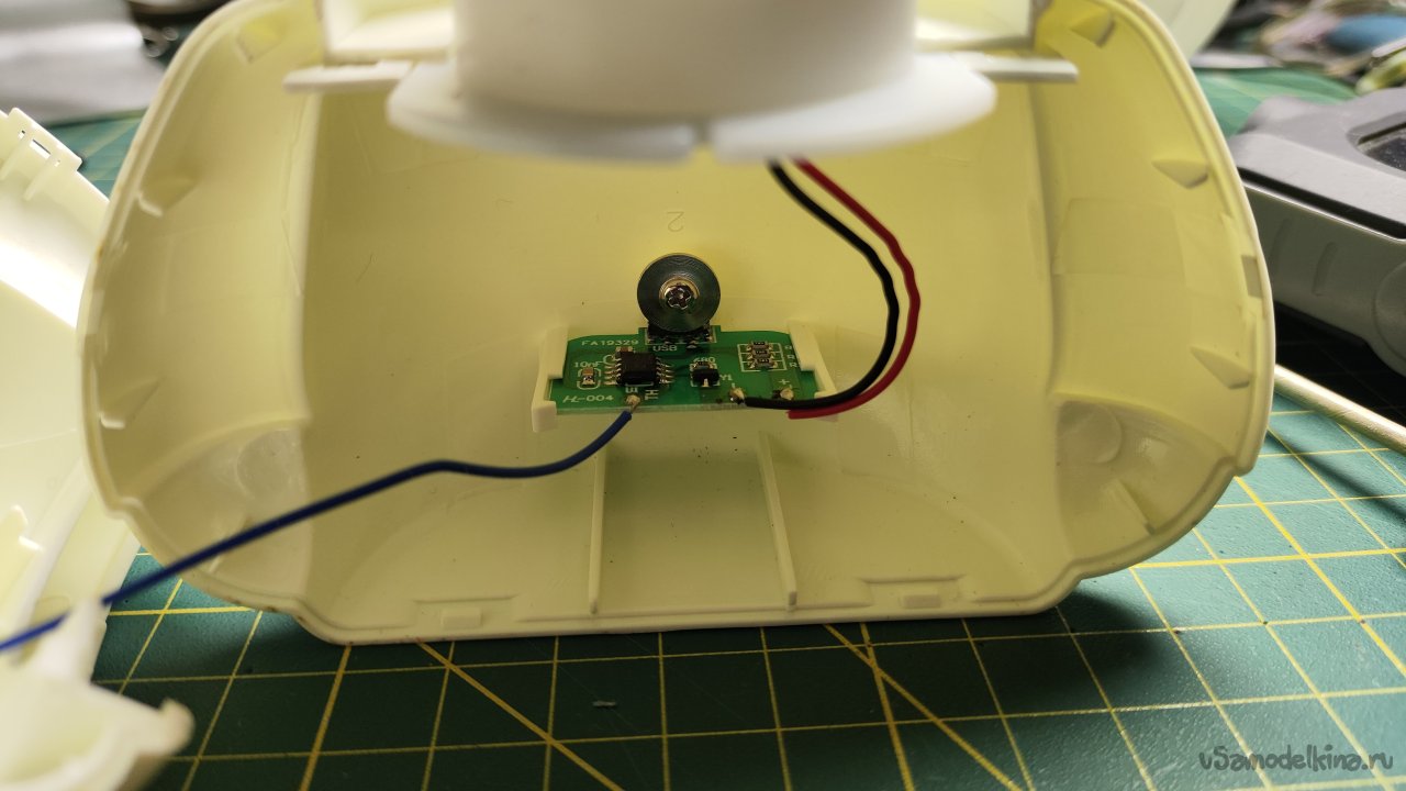 Припаиваю на место отпаянные ранее провода. Проверил, все работает. Собираю светильник. Опять проверка. При касании сенсора светильник устанавливает три яркости свечения, при каждом касании все ярче. При четвертом касании выключается.