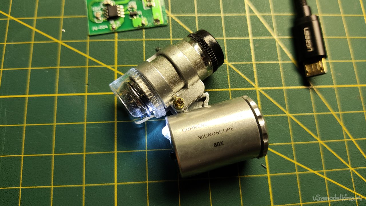 Осмотрел контакты с помощью микроскопа, чтобы лучше понять, что, как и куда припаять. Много лет пользуюсь таким ручным микроскопом с подсветкой: