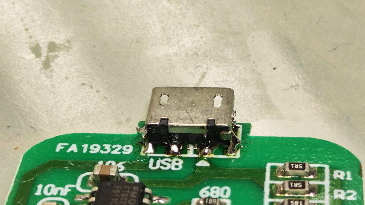 Разъем пропаян паяльником с тонким жалом. Как контакты пропаяны, так и сам корпус, который тоже в двух точках оторвался от платы.