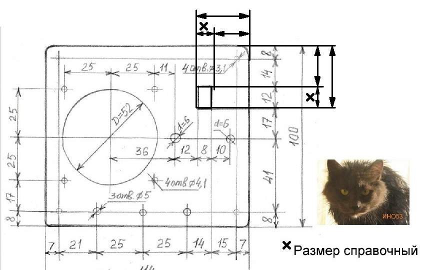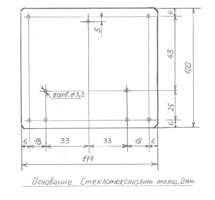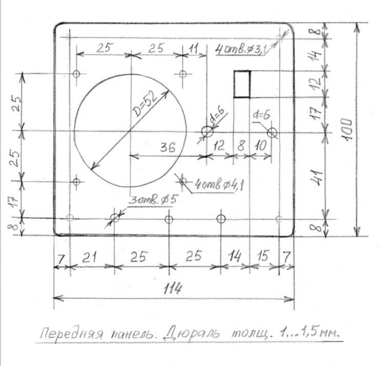 Эскиз дюралевой передней панели ЕСБС, имеющей размеры 114 х 100 х 1 мм. 15-миллиметровое отверстие под гнездо СГ5 первоначально делать не предполагалось и, поэтому на рисунке 07Б не показано.