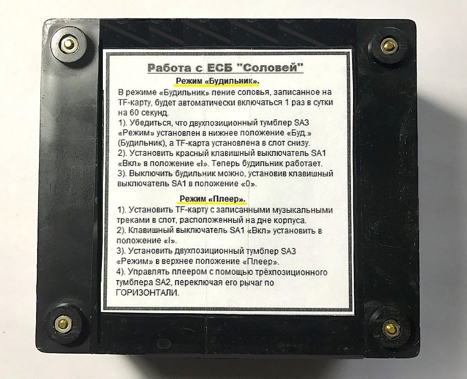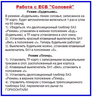 Посмотреть основные принципы эксплуатации ЕСБС в режимах «Будильник» и «Плеер» можно по инструкции, приклеенной к задней стенке корпуса (см. рисунок 05).