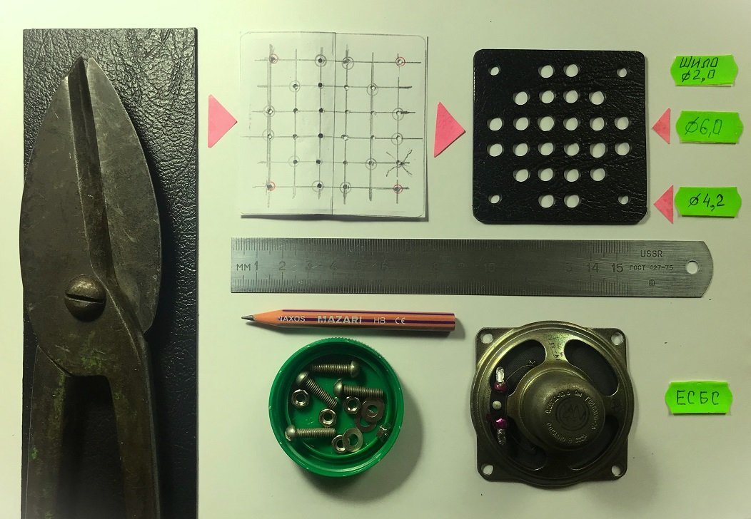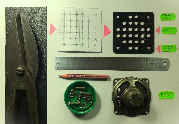Для защиты диффузора динамика BA1, из тиснённого пластика толщиной 2 мм изготовлена декоративная решётка размером 65 х 67 х 2 мм. Решётка, размеченная штангенциркулем, вырезается из листа поделочного пластика ножницами по металлу. Расстояние между центрами 6 - миллиметровых отверстий составляет 10 мм. Динамик BA1 крепится к передней панели четырьмя латунными (или стальными) винтами М4 х 16 с комплектом шайб и гаек
