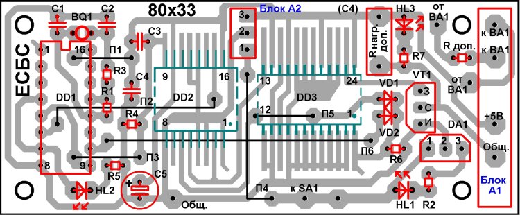 Вид на ЕСБС сверху - спереди. Перед поделкой выложены рисунки схемы расположения и трассировки ПП ЕСБС.