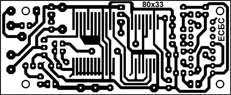 Печатная плата ЕСБС выполнена из односторонне фольгированного стеклотекстолита размером 80 х 33 х 1,5 мм. (см. рисунки 02 и 03).