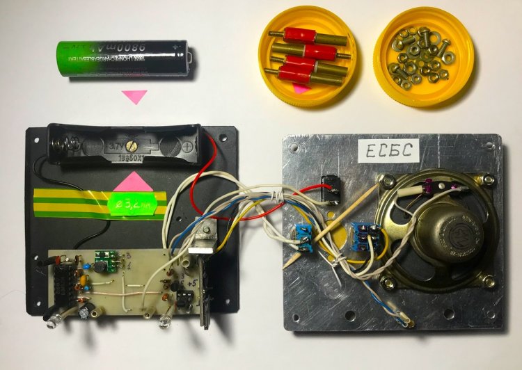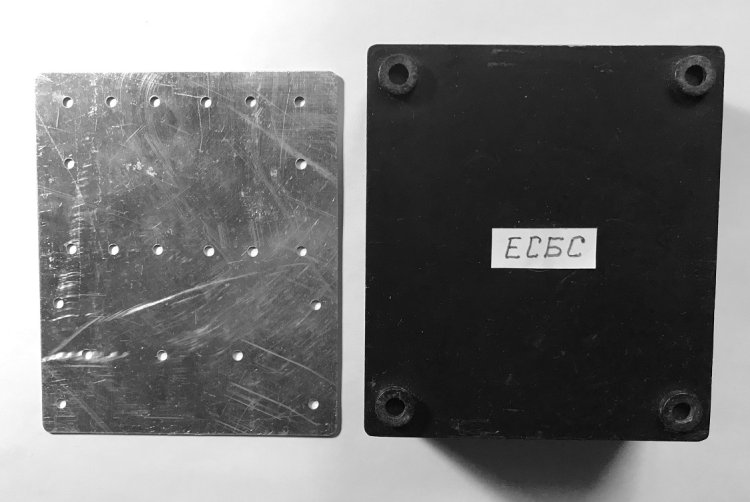 Печатная плата ЕСБС и остальные детали устанавливаются в пластмассовом корпусе, имеющем толщину стенок 3 мм и габаритные размеры 119 х 45 х 106 мм. Дополнительно для корпуса изготавливаются пластиковая вкладка (рабочее основание) и дюралевая верхняя крышка с одинаковыми размерами 113 х 100 х 2 мм, которые плотно вкладываются в корпус.