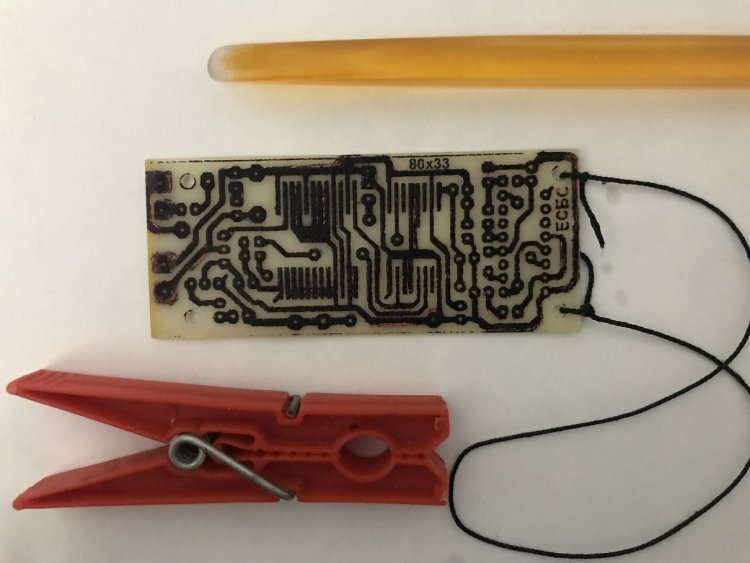 При травлении ПП, к двум отверстиям на плате привязывается суровая нить, помогающая вынимать ПП из травящего раствора, не пачкая рук. Нить (чтобы не падала в травящий раствор) прижимается бельевой прищепкой к стенке стеклянной банки (или другой ёмкости для травящего раствора). ПП с тонкими дорожками иногда лучше немного не до травить (см. рисунок 08), чем тонкие дорожки чрезмерно утончатся и будут с обрывами. Редкие и мелкие «непротравы» легко устраняются скальпелем или резаком. Проверено также дополнительное нанесение капель травящего раствора (на уже протравленную плату) фрагментарно, где травление не завершено. Правда, непоседам такой вариант доработки платы не рекомендуется.