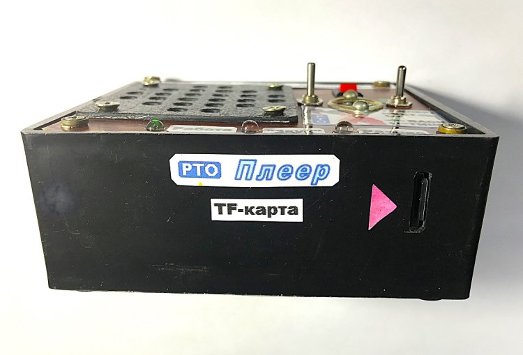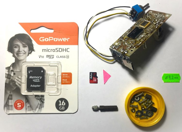 Слева – упаковка и собственно TF-карта (microSDHC). Справа – ПП ЕСБС в сборе с установленным на неё блоком А1 (плеером). Adapter (чёрного цвета), не вынутый из упаковки, в ЕСБС не используется.