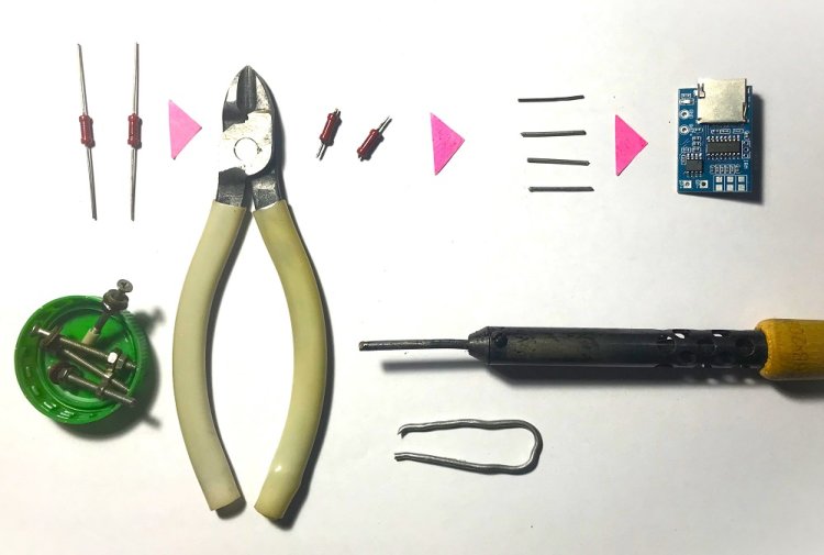 Выводы (проволочные «ножки» диаметром 0,8 мм) для установки блока А1 на ПП отрезаны от резисторов ОМЛТ 0,5. Более толстые «ножки» можно взять, например, от резисторов МЛТ1 и МЛТ2.