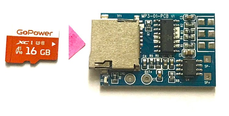 На модуле MP3-01-PCB (на блоке А1) начинает мигать c частотой 0,5 Гц красный smd – светодиод D1 и через 0,5 … 1 секунды начинается воспроизведение трека, записанного на TF-карту. Если TF-карта в слот блока А1 не установлена, то светодиод smd D1 будет светиться непрерывно. Вставлять и вынимать TF-карту желательно при выключенном питании. Однако 3 экспериментальных случая такого («горячего») вынимания и установки карты к поломке плеера не привели.
