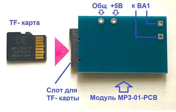 TF-карта вставляется в слот модуля А1 контактами влево. При этом если питание включено, то сразу же начинается воспроизведение трека. Если звука нет, а красный D1 мигает, то причиной может быть ранее установленная на «0» громкость воспроизведения. Уровень громкости запоминается при выключении ЕСБС.