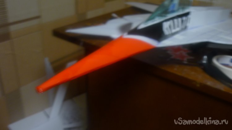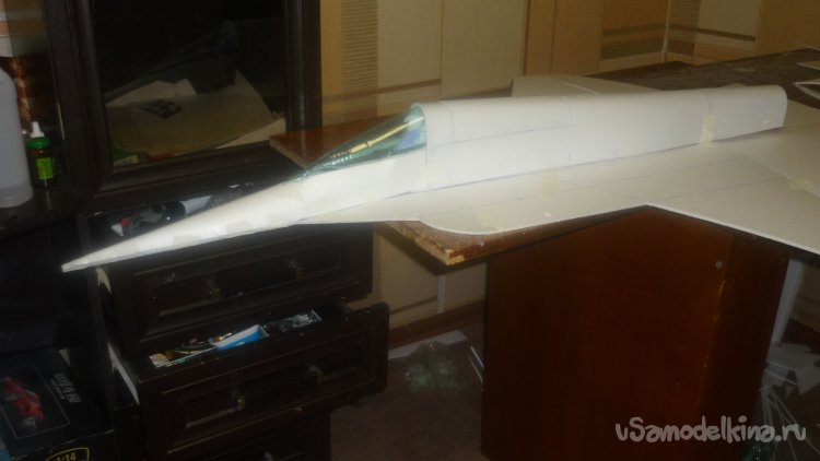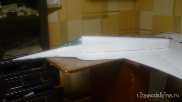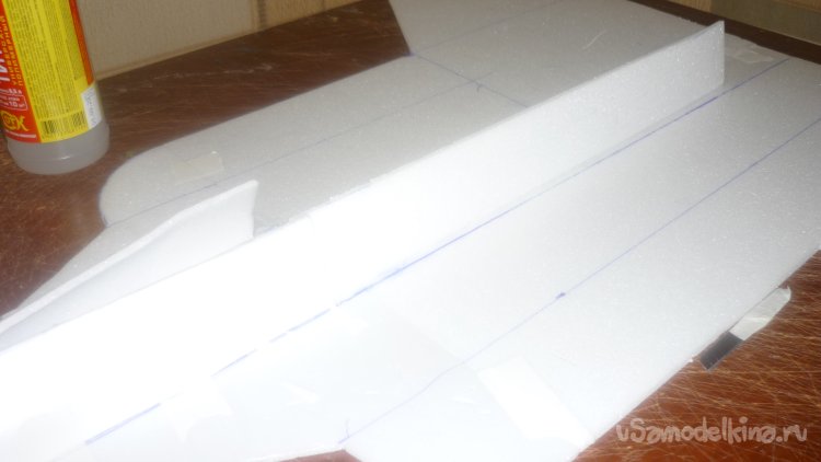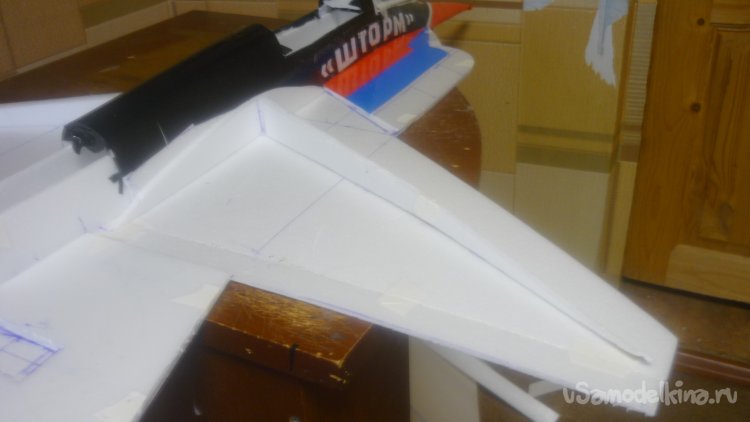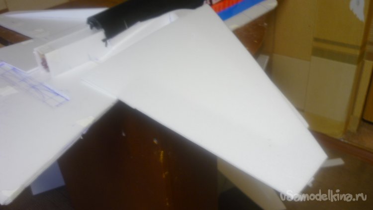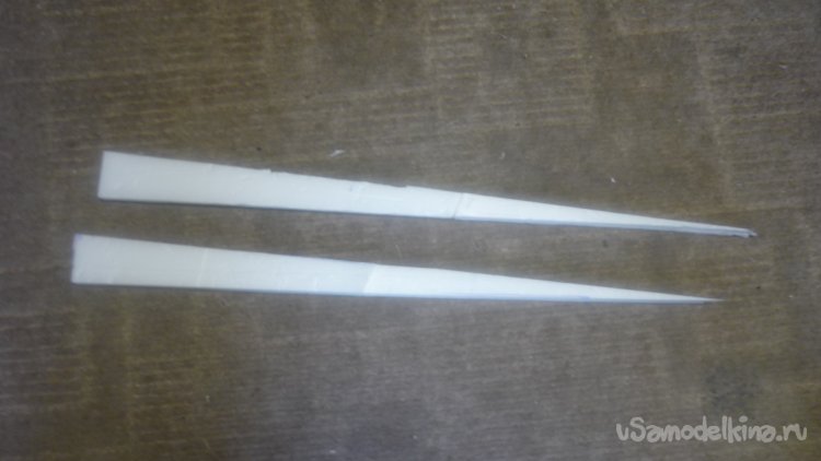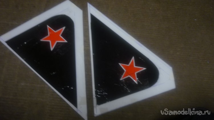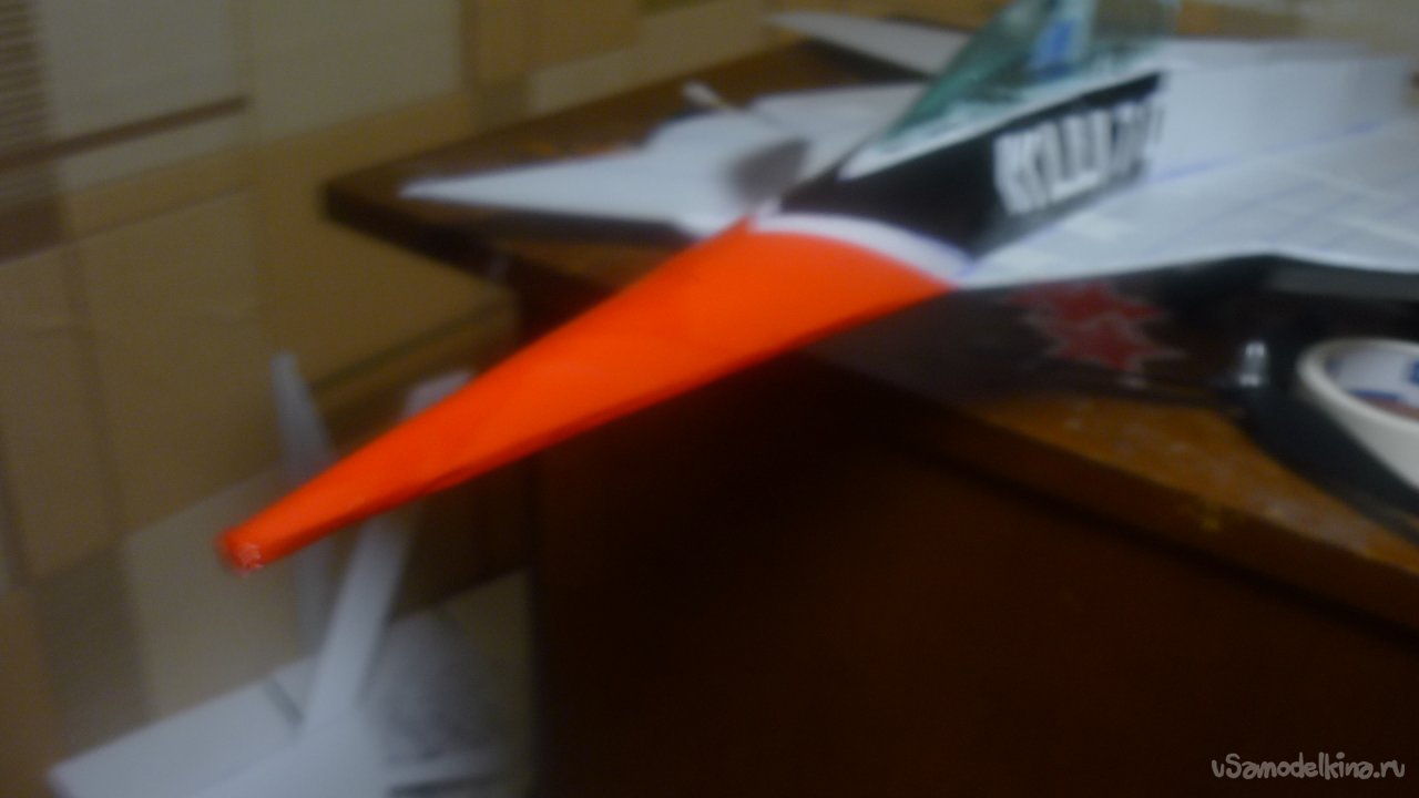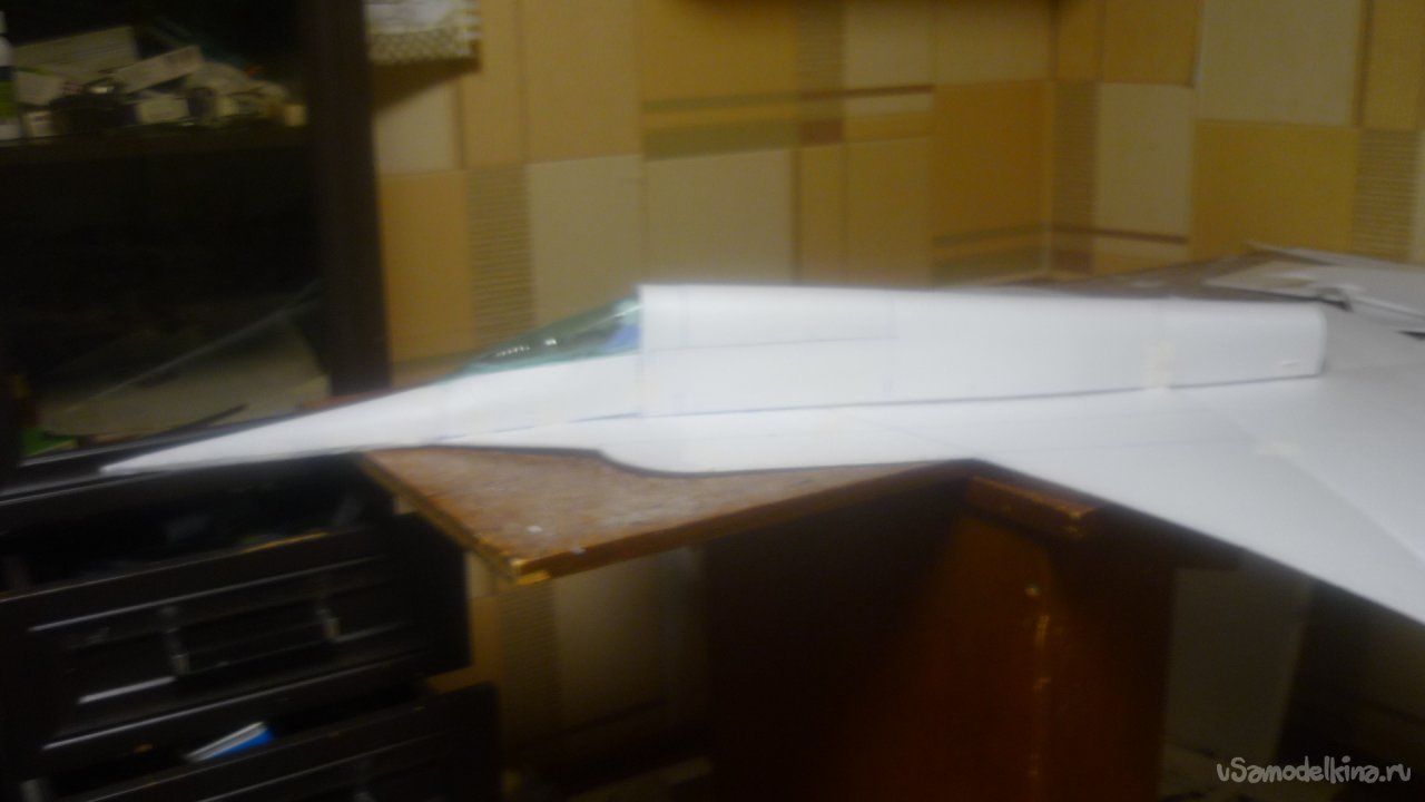 .Выкраиваю заготовки , недостающего внешнего покрытия хвостовой части модели, примеряю и вклеиваю.