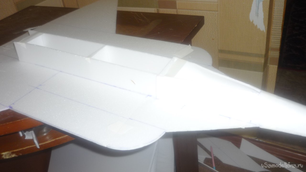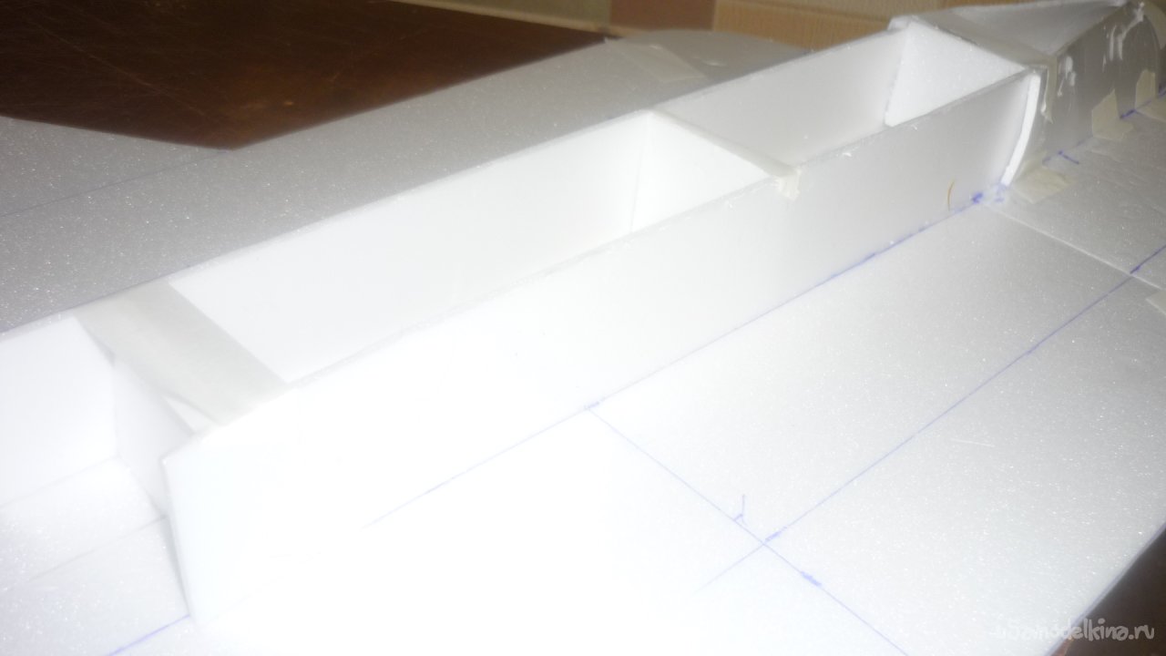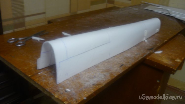 Теперь выкраиваю заготовку внешней обшивки фюзеляжа и вклеиваю в неё вертикальные перегородки, для жёсткости.