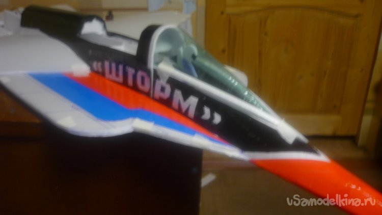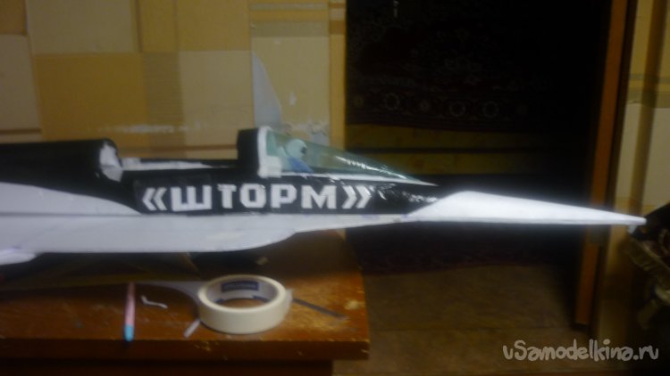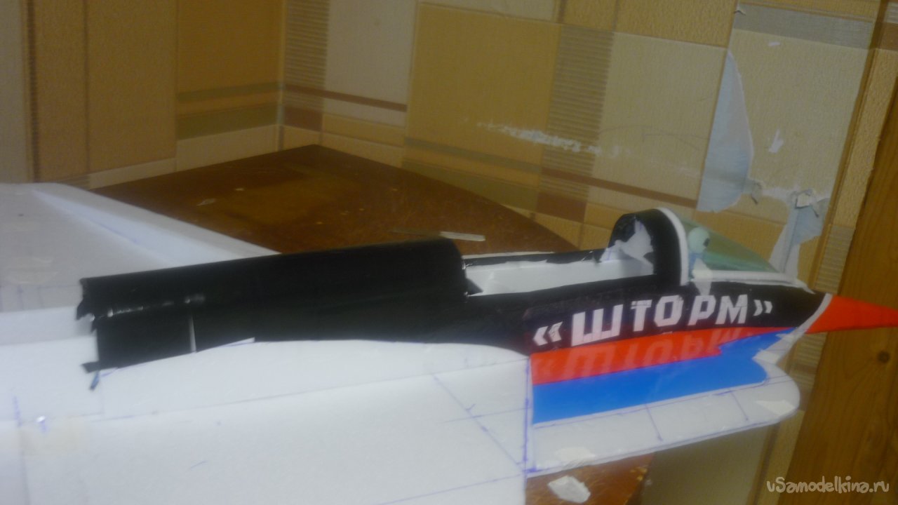 Выкраиваю, монтирую недостающие элементы внешнего покрытия в носовой части модели и обтягиваю цветным скотчем..