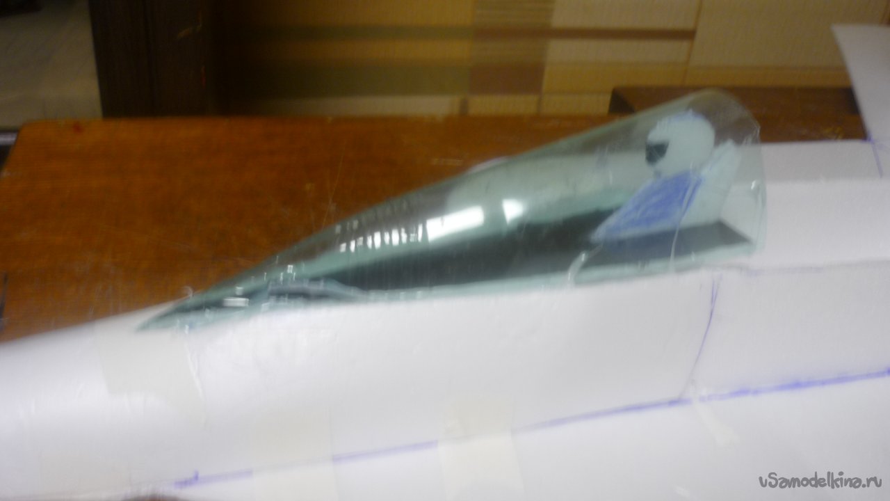 Вырезал заготовки для кабины, фигурку пилота и очтекление кабины. Остекление вырезал из пластиковой бутылки. Смонтироал.
