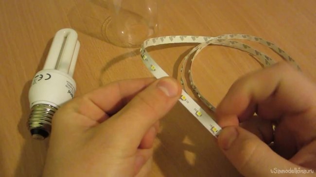 Для начала берем нашу светодиодную ленту и разрезаем ее на 24 части. Лента, которую использует автор самоделки, имеет сегменты с тремя светодиодами в каждом. Три светодиода каждого отдельного куска загораются при подаче 12 вольт. При последовательном соединении 24 кусков, у нас получится 220 вольт, что равно напряжению обычной лампочки. Процесс разрезания светодиодной ленты не представляет какой-либо сложности, поскольку на ленте предусмотрены специальные места для разрезов. После того, как все куски готовы, необходимо отрезать маленькую часть от бутылки и приклеить все куски ленты по периметру.
