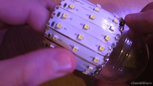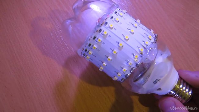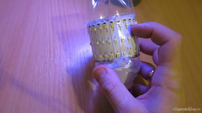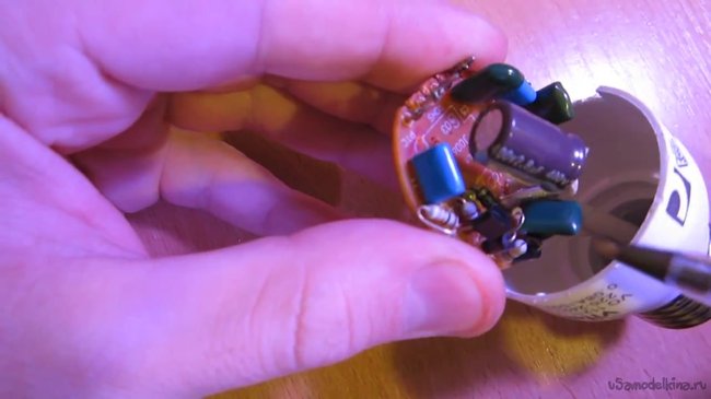 Что ж, сложная часть работы осталась позади. Теперь нам остается всего лишь припаять провода, идущие от светодиодной ленты к контактам конденсатора, сохраняя полярность, а также приклеить кусок пластиковой бутылки, на который приклеены куски светодиодной ленты на нижнюю часть экономной лампочки.