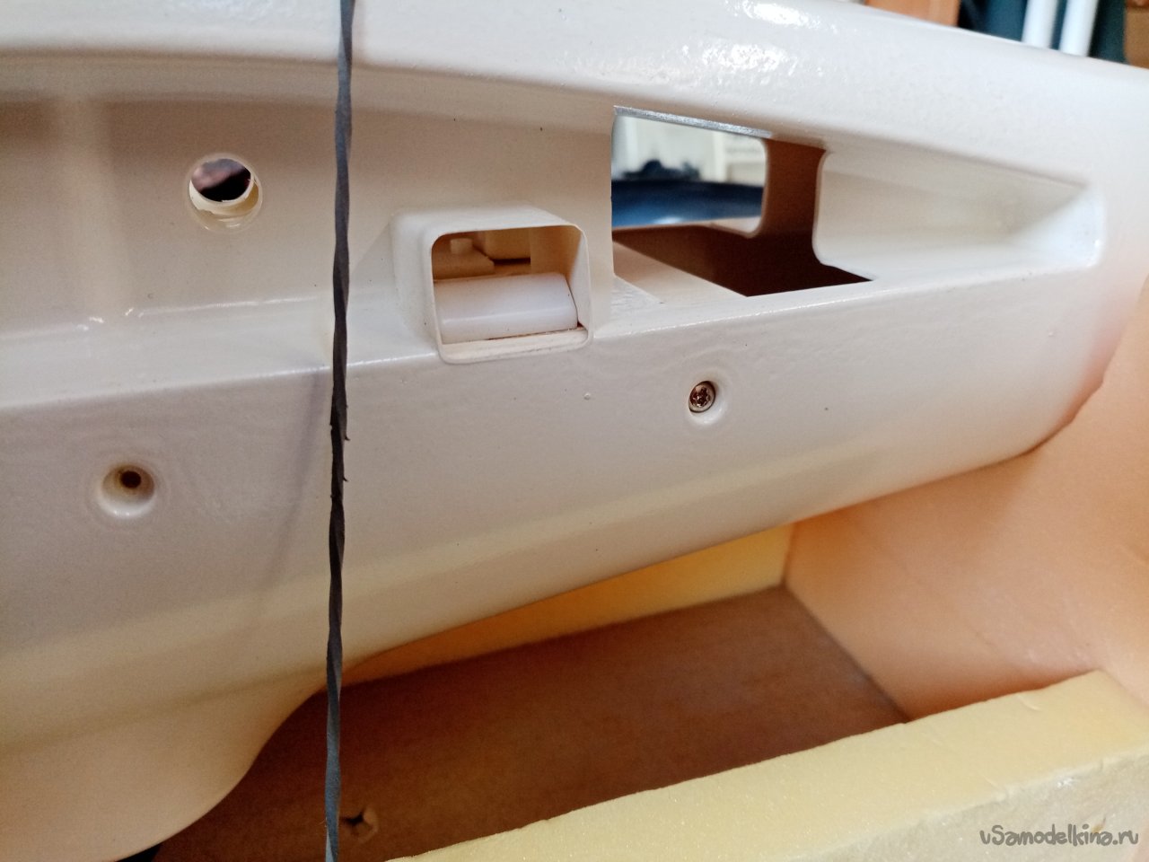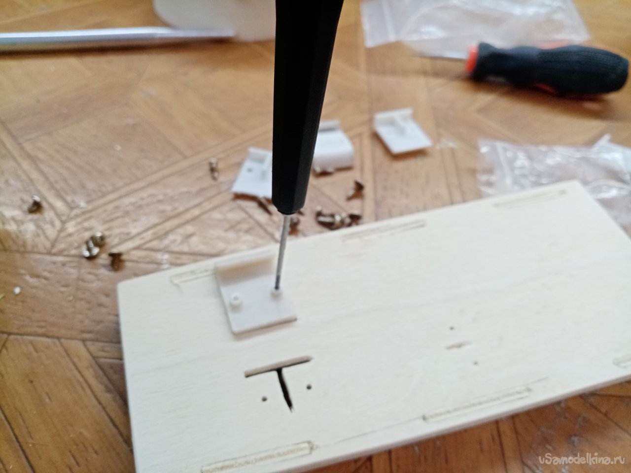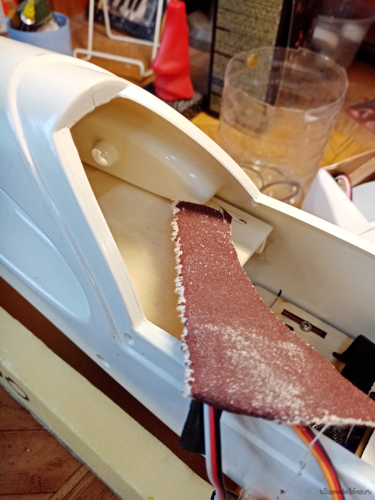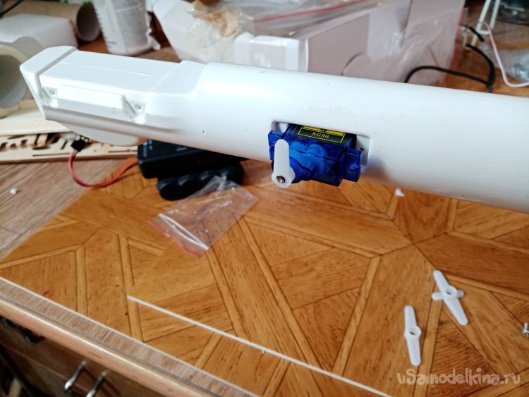 Сервоприводы закреплю в специальных нишах болтиками. На разобрал. Не нравится мне толщина пластикового корпуса в местах крепления сервоприводов. Вырезал из пластика прямоугольники и вклеил их в месте крепления лапок сервопривода. Се приклеил при помощи клея для пластиковых моделей. Но пришлось серьезно повозиться, приклеивая пластик к внутренней стенке фюзеляжа. Долго ковырялся, однако. Наконец со второго захода сервоприводы надежно закреплены. Установил тяги и фиксирующие колечки.