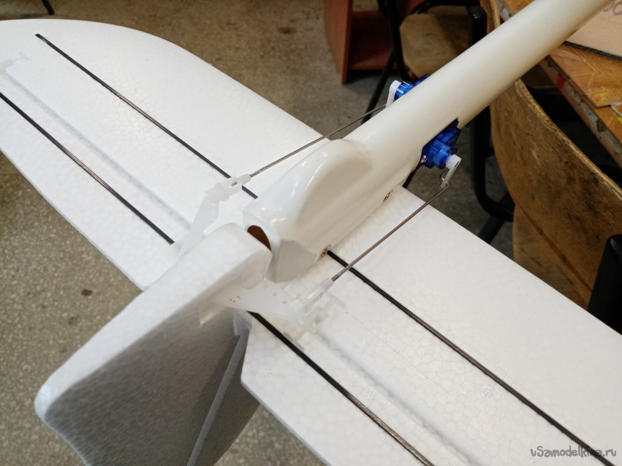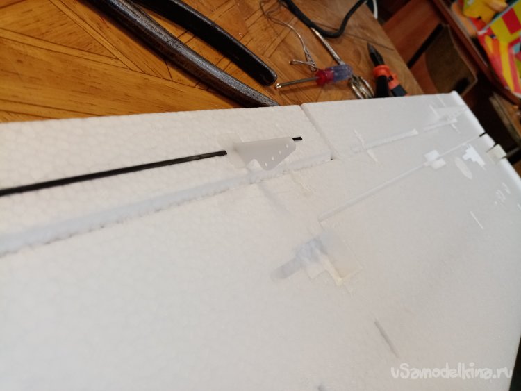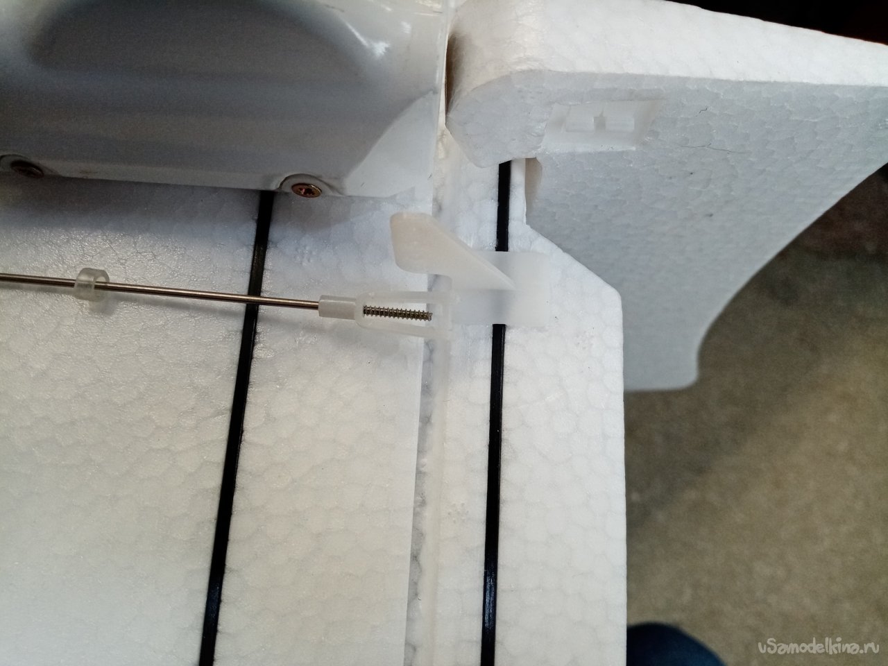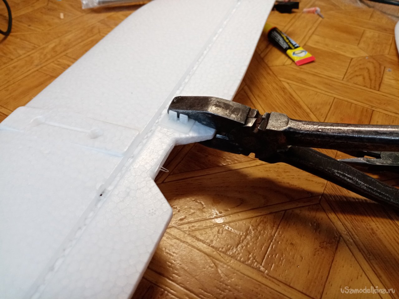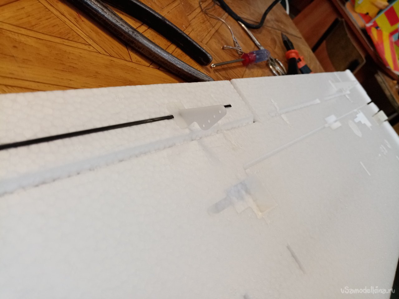 Флапероны на крыле зафиксированы, можно летать, без них. Мне такая ситуация не нужна. Эти элементы действуют при посадки как тормоза и планировании изменяют камбер крыла. Повышая подъемную силу. Поэтому отрезаю перемычки при помощи треугольного ножа для творчества. Сервоприводы установлены, закрепляю тяги на кабанчики. Дополнительная фиксация соединения тяги при помощи эластичных колечек.